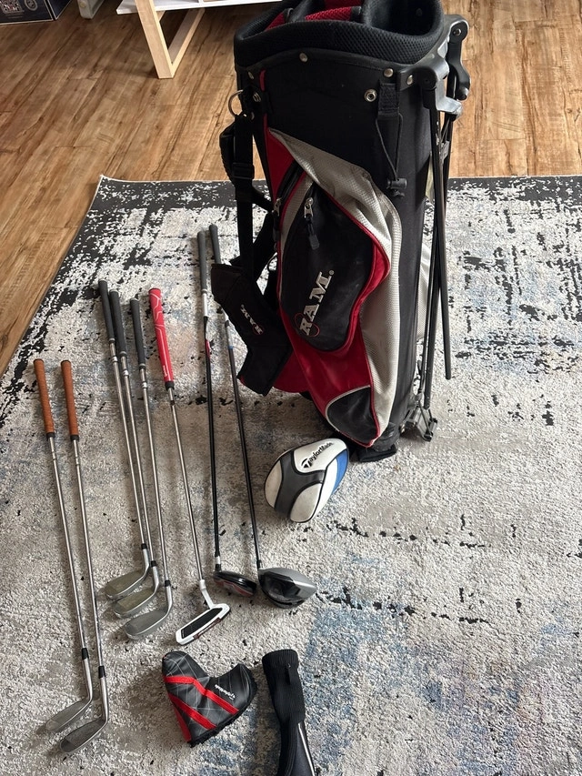 This is a used RAM golf bag complete with a set of clubs, perfect for anyone looking to get into golfing or needing a spare set. The set includes various irons, a driver, and a putter to cover all your needs on the course. Being a used set, they have signs of wear but are still very functional and ready for play. Comes with Taylor made driver, Ram 3 wood, 8, 9 and PW irons, two wedges, and a Taylor made putter. Includes golf balls and tees. If this ad is still up, the golf bag and clubs are available.
