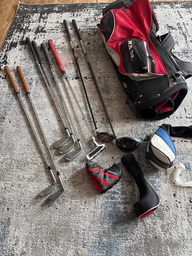 This is a used RAM golf bag complete with a set of clubs, perfect for anyone looking to get into golfing or needing a spare set. The set includes various irons, a driver, and a putter to cover all your needs on the course. Being a used set, they have signs of wear but are still very functional and ready for play. Comes with Taylor made driver, Ram 3 wood, 8, 9 and PW irons, two wedges, and a Taylor made putter. Includes golf balls and tees. If this ad is still up, the golf bag and clubs are available.