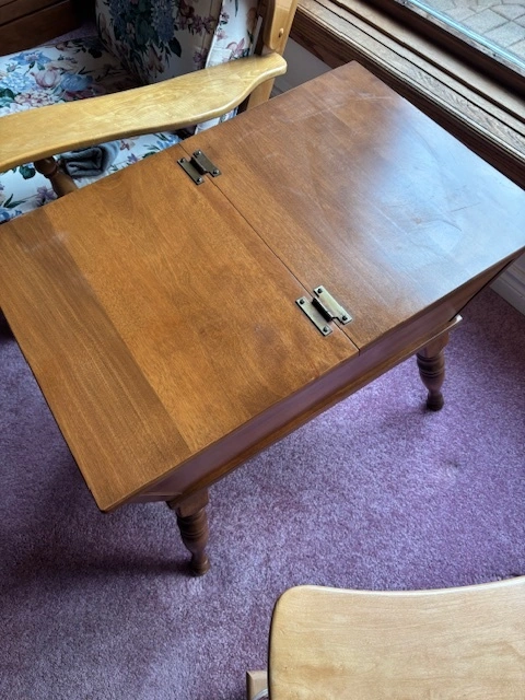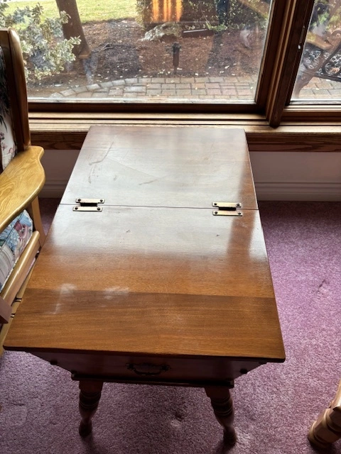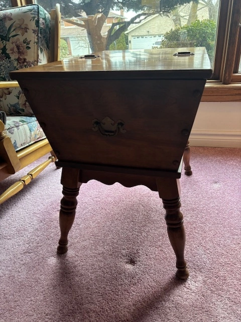 This is a Vintage Ethan Allen Baumritter Colonial Dough Box End Table with Storage and Drop Leaves (1950s-60s) Quality is often higher than modern furniture under $1,000 today.