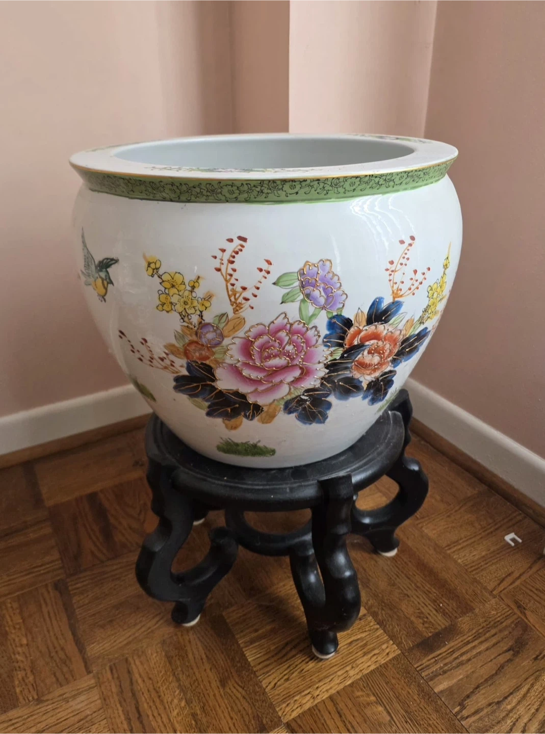 This is a lovely ceramic pot featuring a colourful floral and bird design. It includes a wooden stand. This decorative piece would add a touch of elegance to any room.