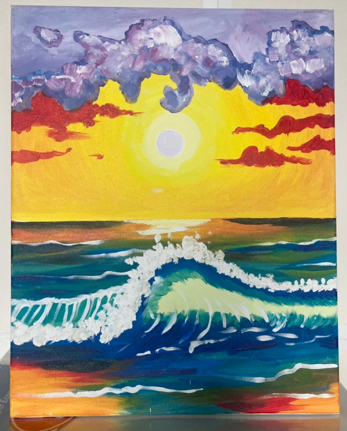 Acrylic painting on canvas depicting a colourful sky and an ocean wave. It's a unique piece, perfect for adding a splash of coastal colour to any room! “16 x”20