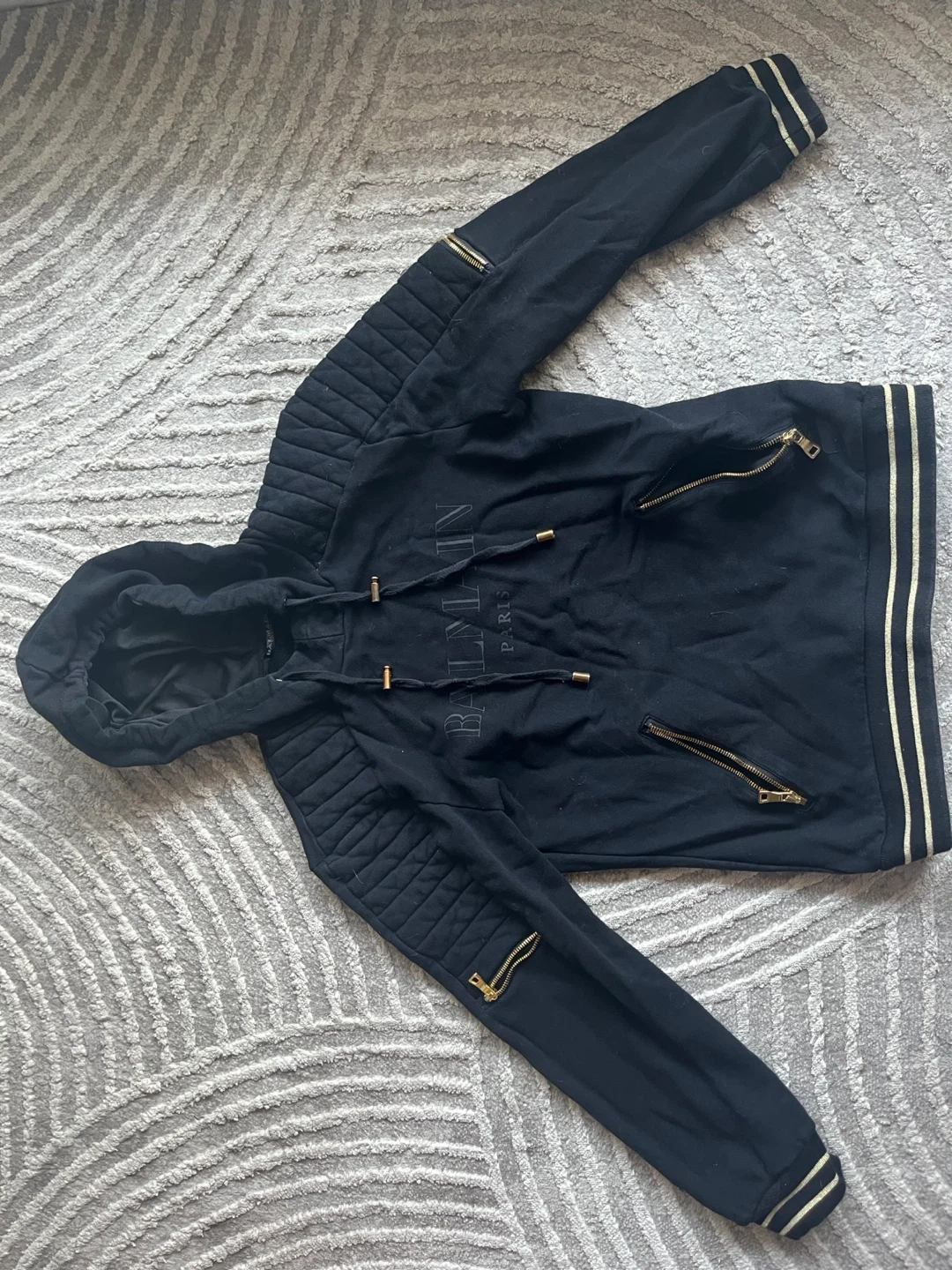 Black Balmain Paris hoodie with gold stripe detailing on the cuffs and hem. Features zip pockets and a drawstring hood. Comfortable and stylish.