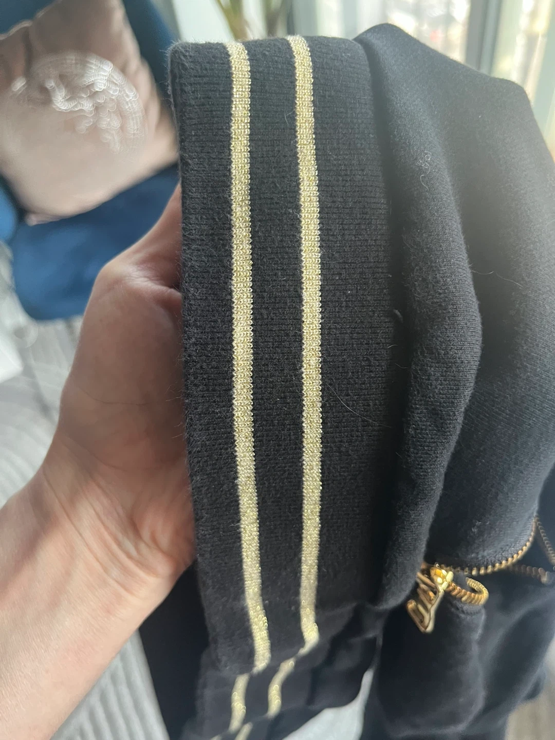 Black Balmain Paris hoodie with gold stripe detailing on the cuffs and hem. Features zip pockets and a drawstring hood. Comfortable and stylish.