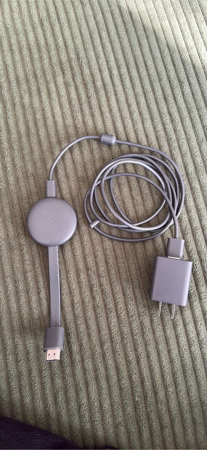This is a Google Chromecast device for streaming media to your TV. It's a compact and easy-to-use gadget that connects via HDMI. The device comes with its power adapter and cable.
