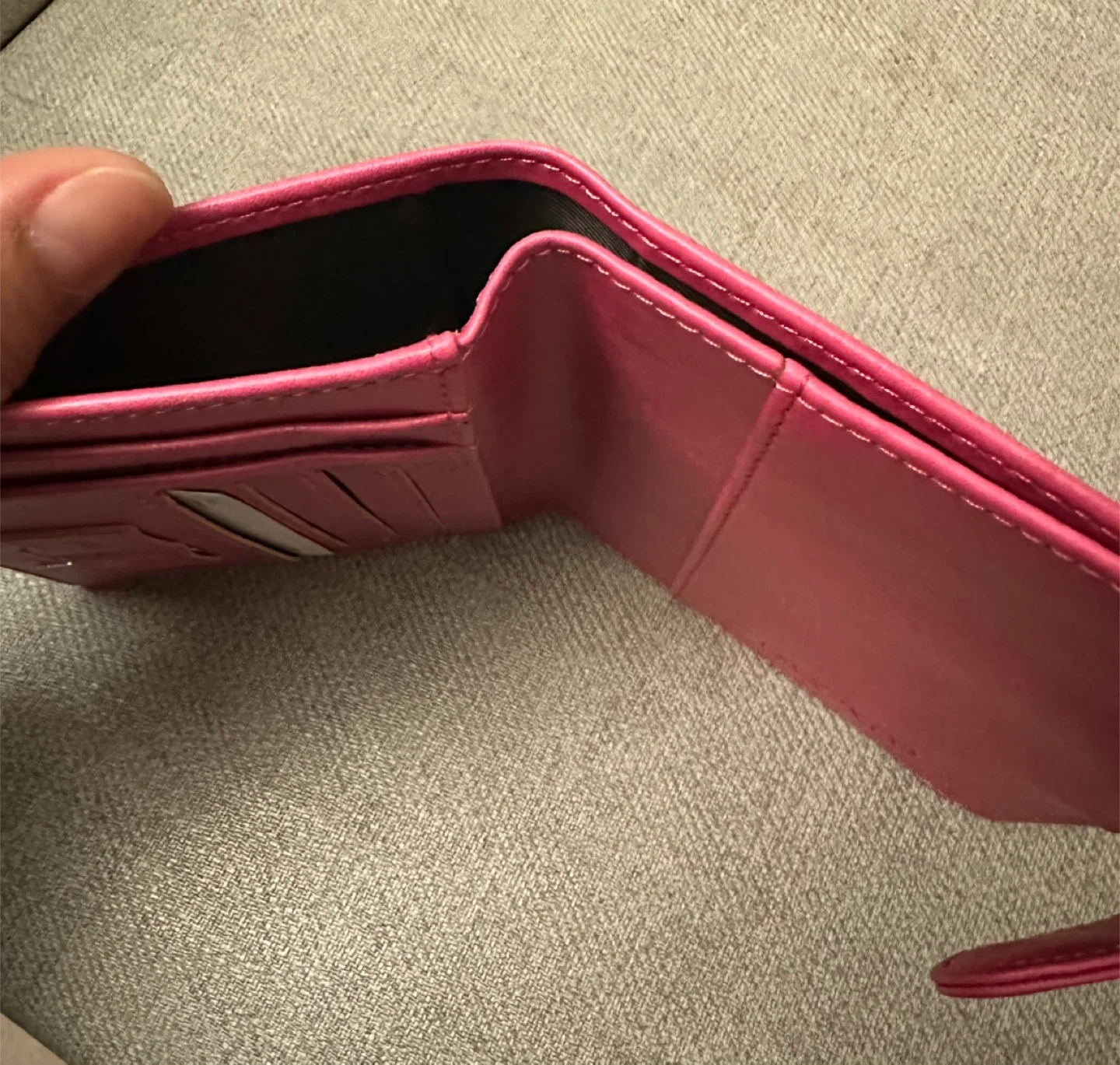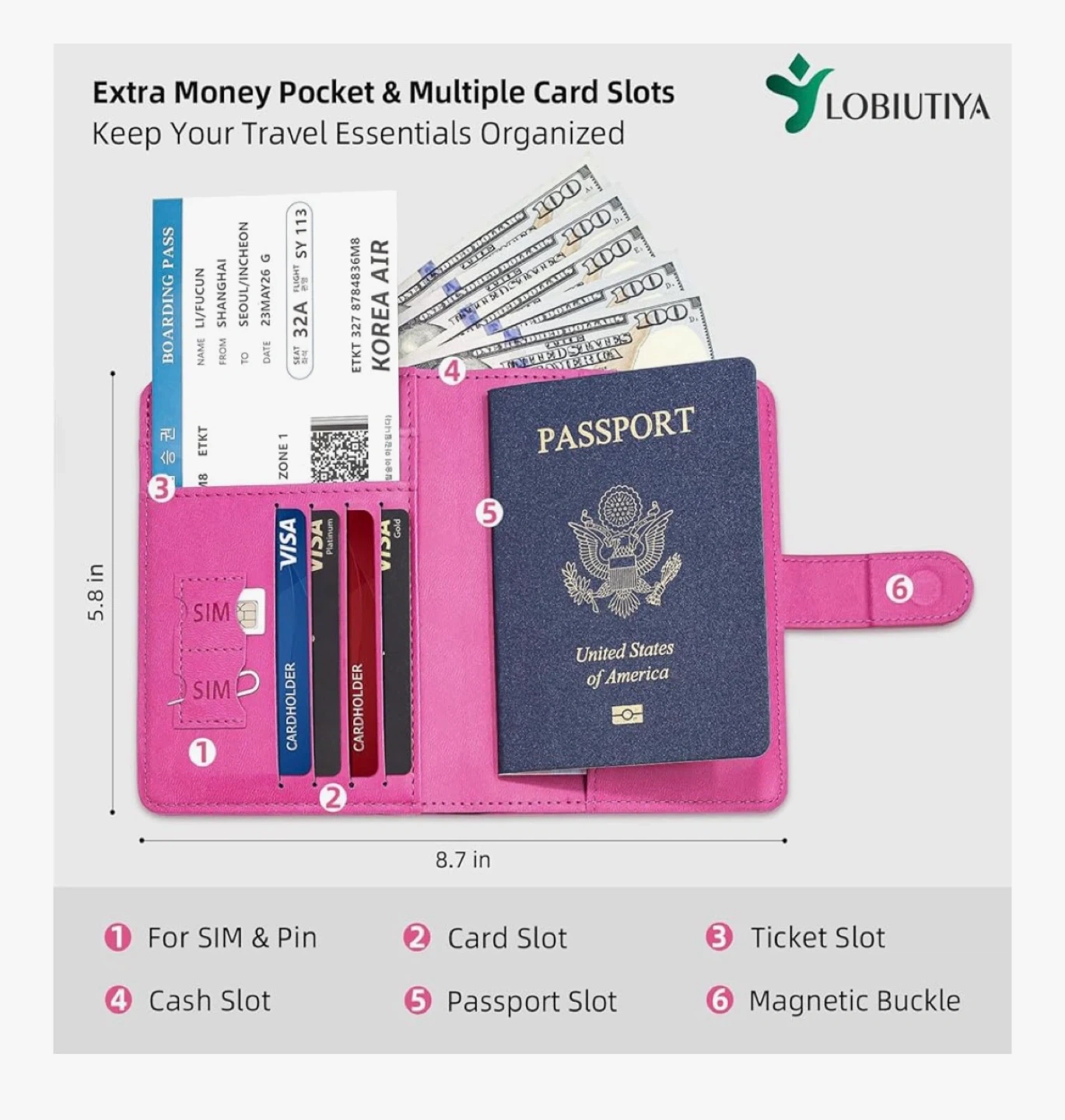 Keep your travel essentials organized with this pink passport holder. It features multiple card slots, a cash slot, and a ticket slot. The magnetic buckle ensures secure closure. It's made from a durable faux leather material.