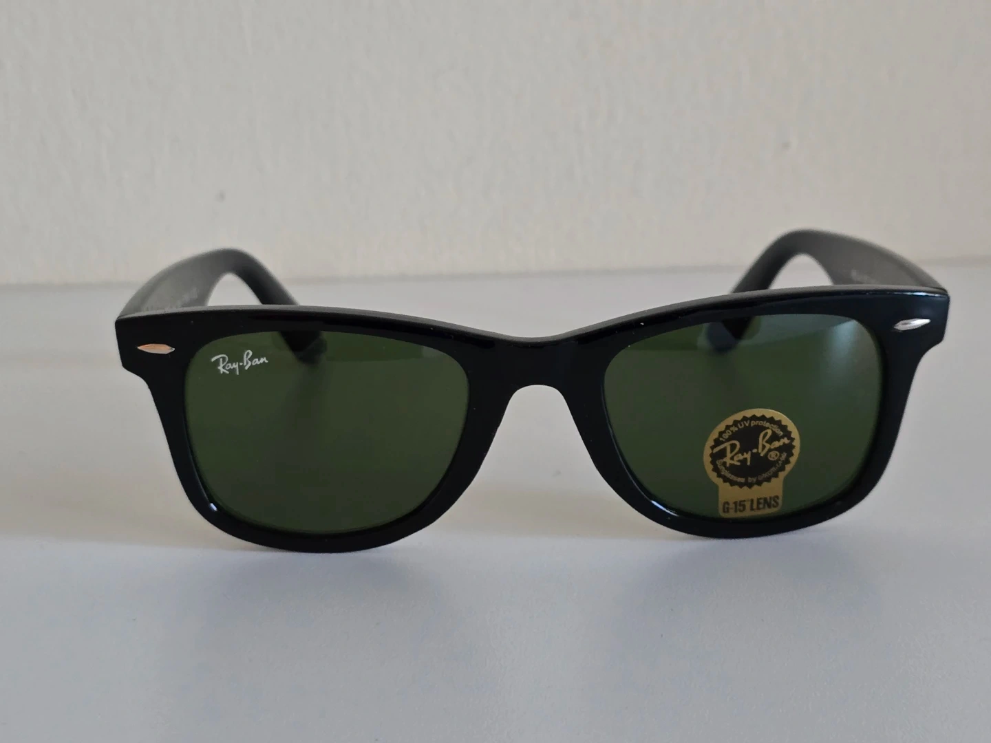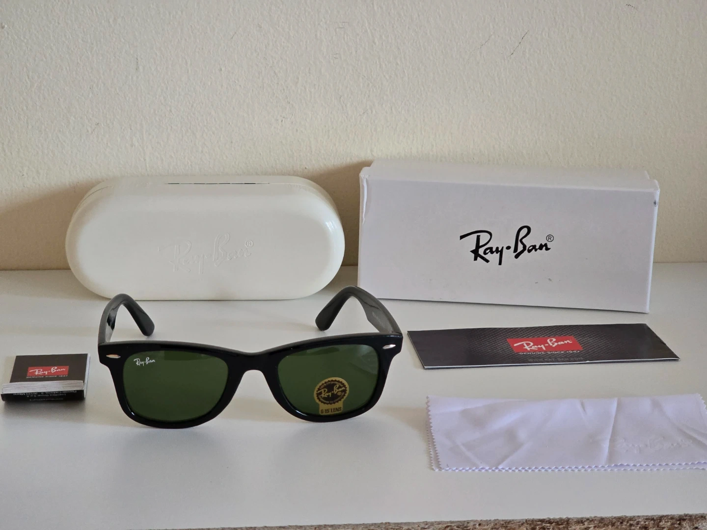 Classic Ray-Ban Wayfarer sunglasses in black with G-15 lenses. Includes original case, box, and cleaning cloth. Made in Italy.