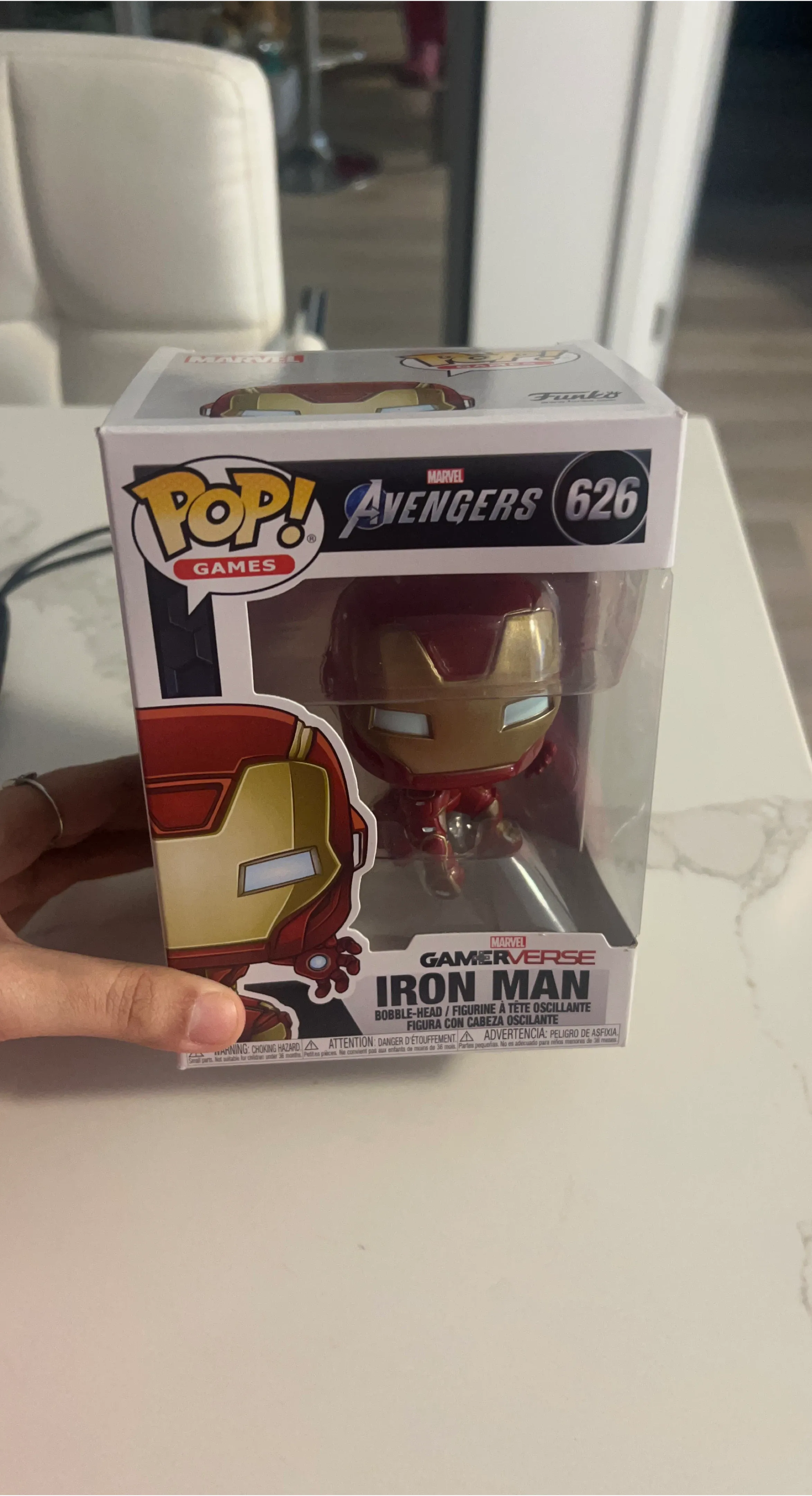 This is a Funko Pop! Games bobble-head figure of Iron Man, model number 626. It's part of the Marvel Gamerverse series. The figure comes in its original packaging.