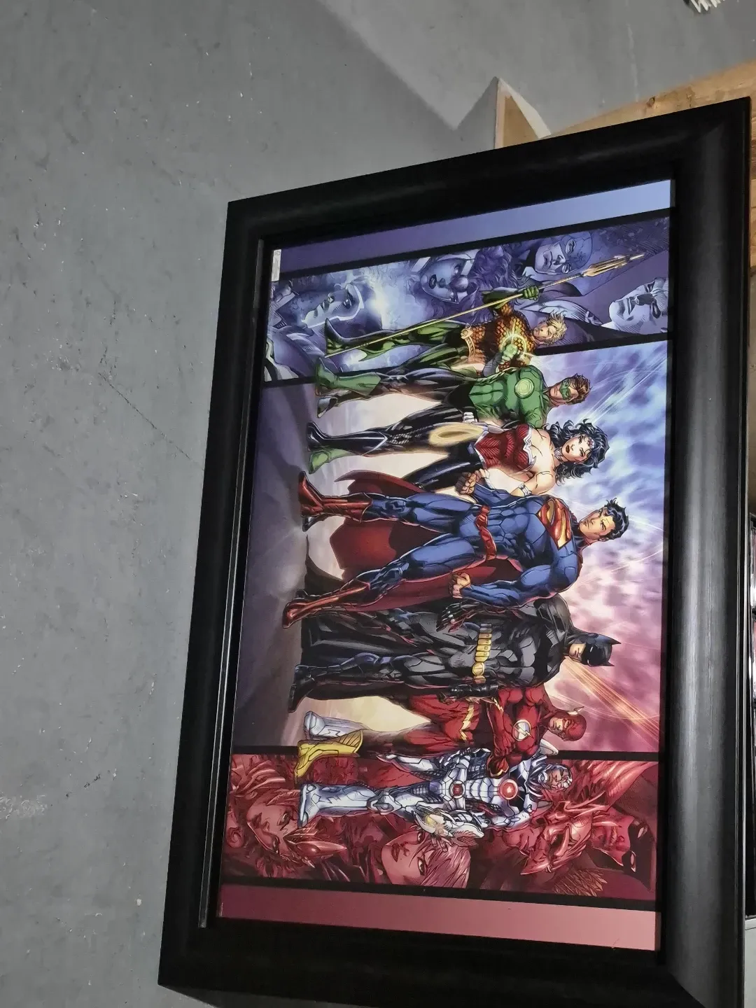 This framed poster features an iconic lineup of DC Comics heroes, including Superman, Batman, Wonder Woman, The Flash, Green Lantern, Aquaman, and Cyborg. It's a fantastic piece for any fan's collection. Black frame included.