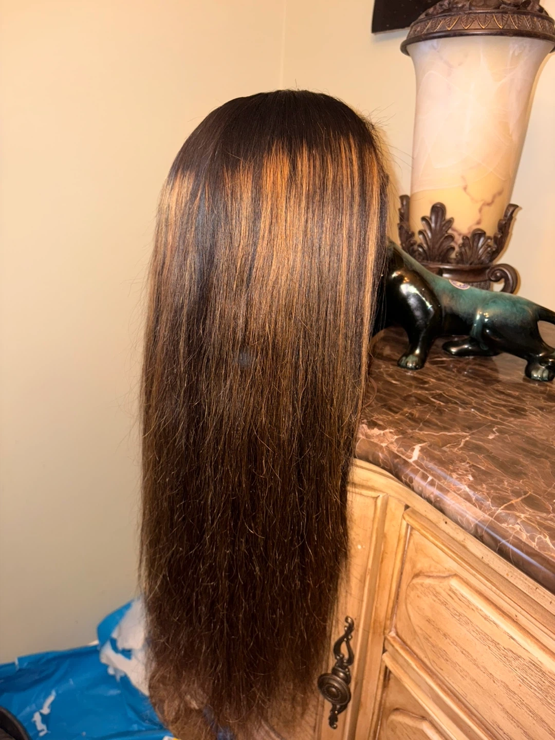 Dark-root brown balayage lace front wig made with 100% human hair. Blend of deep brown and warm caramel highlights for a natural. Hair is silky, smooth, and full, with a realistic pre-plucked hairline and soft baby hairs for a flawless melt.