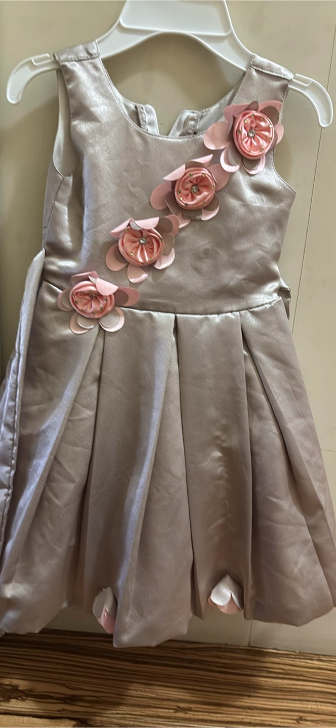This sweet girls' dress features a shimmering taupe fabric with delicate pink flower appliques and pleated skirt. It's sleeveless and perfect for special occasions. This dress is likely for a young child, perhaps for a wedding or party.