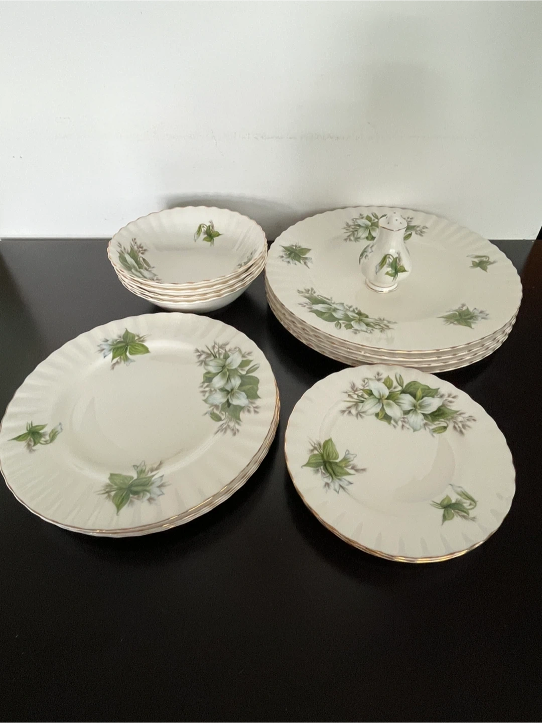Vintage Royal Albert Bone China dinnerware set in the Trillium pattern. Includes plates, bowls, and a salt shaker.