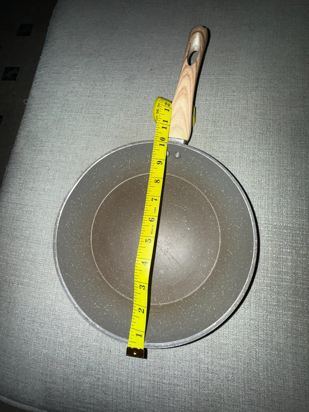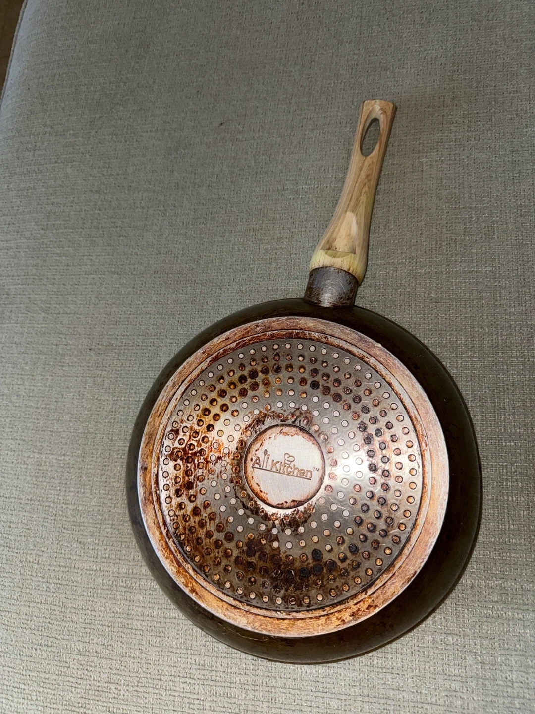 This is an All Kitchen frying pan with a non-stick surface. It measures 10 inches in diameter. The handle is made of wood-look material for a comfortable grip. Good condition 🥕
