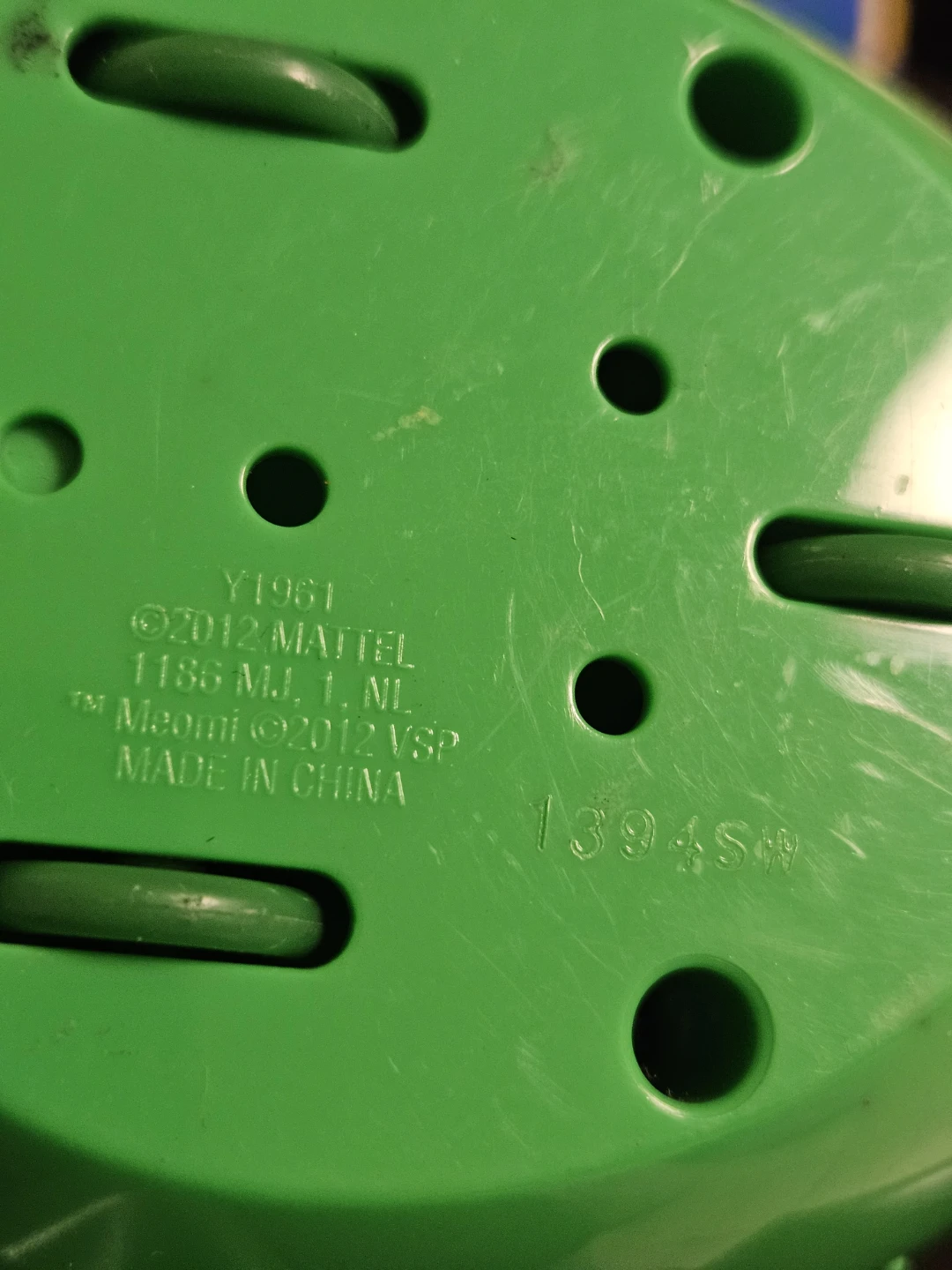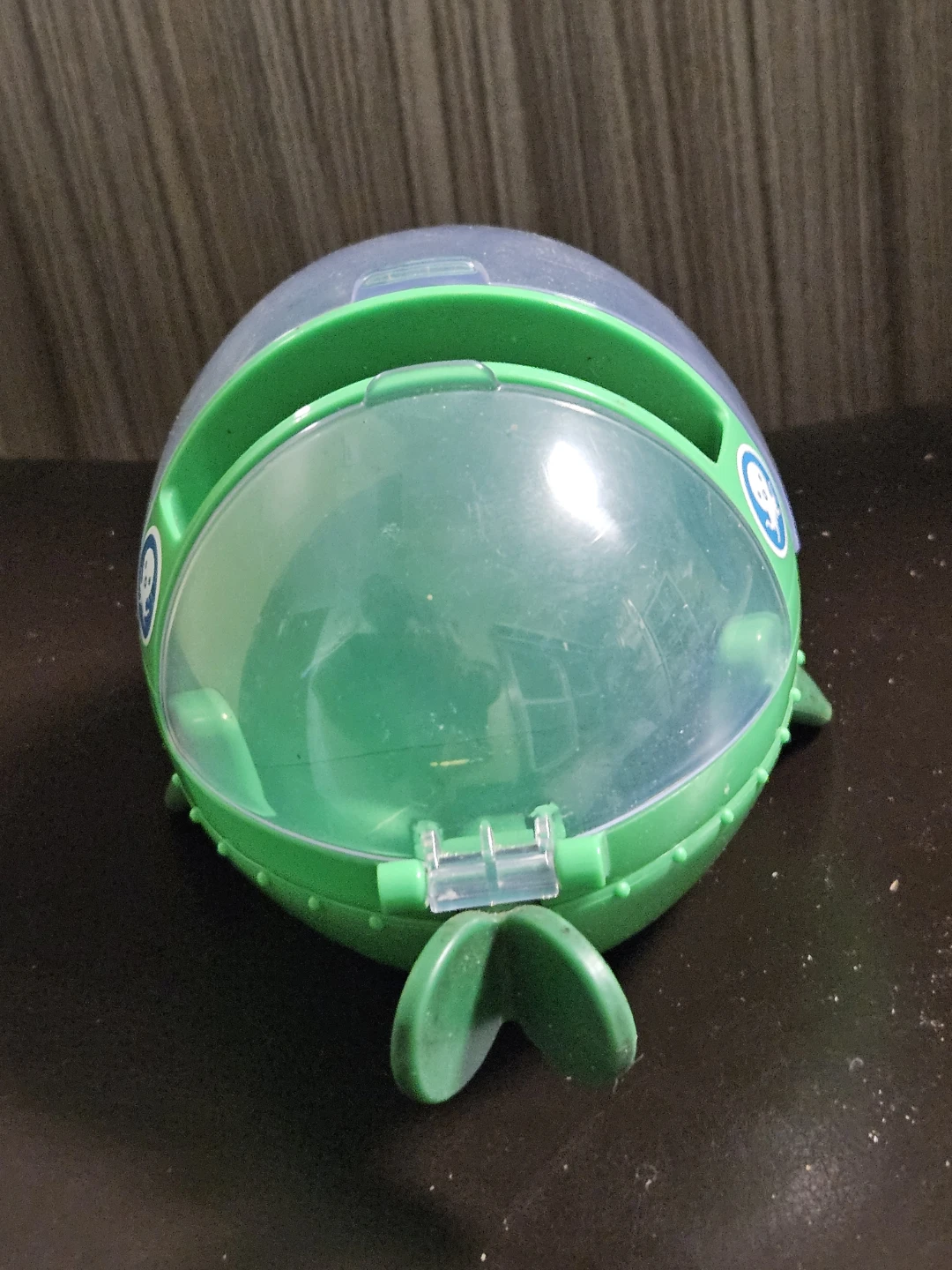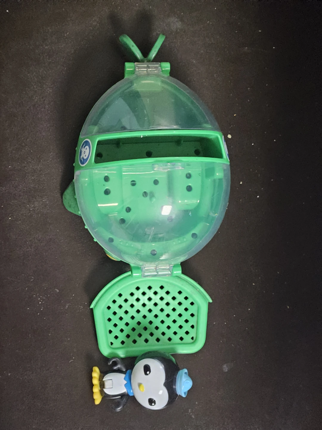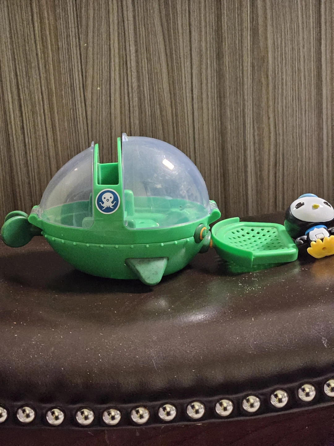 This is the Octonauts Barnacles Penguin vehicle playset. It's green with a clear dome. Includes the Barnacles figure. Plastic material.