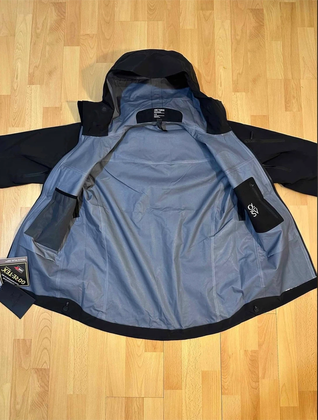 This black Arc'teryx Alpha jacket is made with GORE-TEX. It features RECCO technology for safety. The jacket's shell is 100% nylon with a waterproof ePTFE membrane.