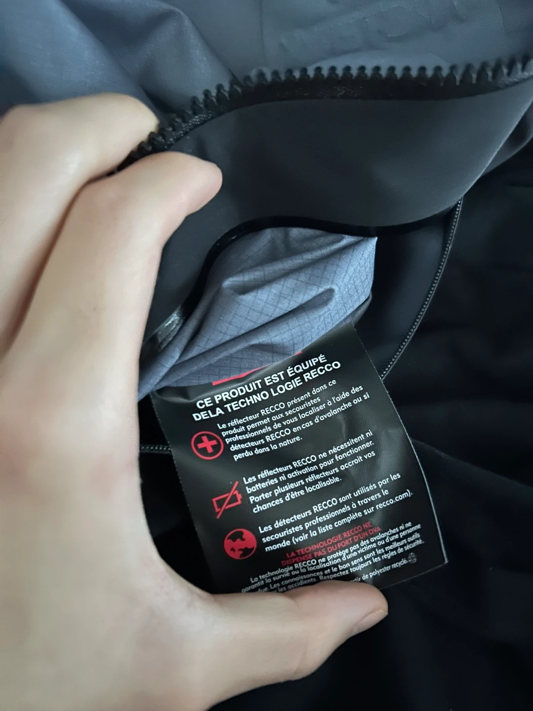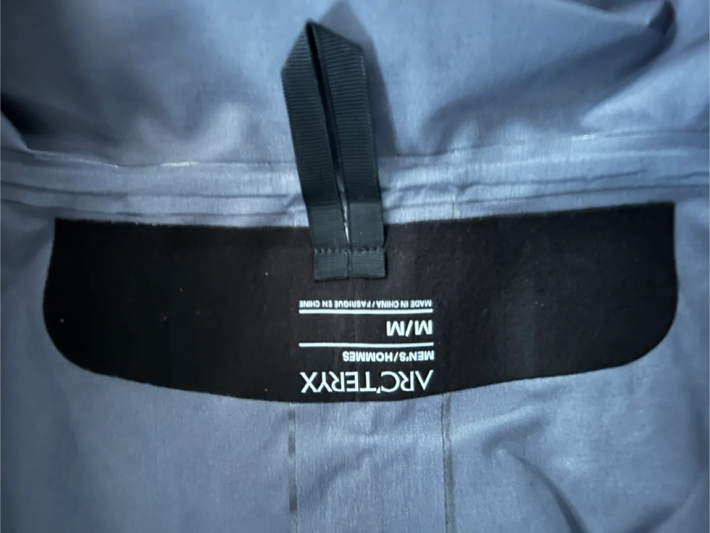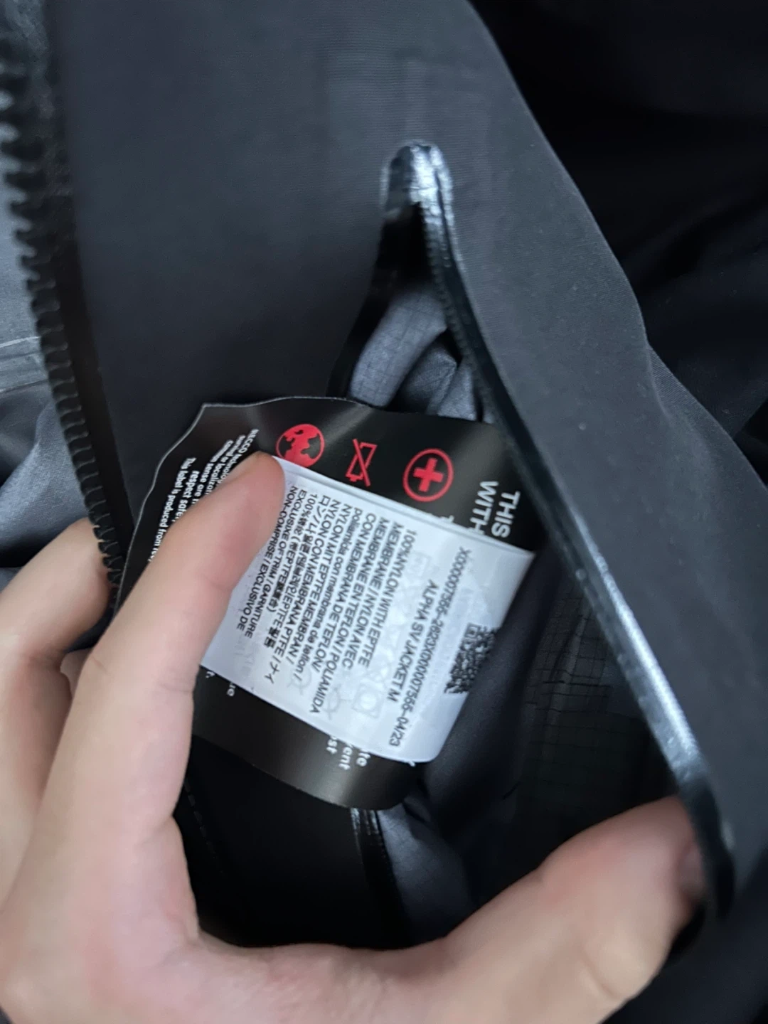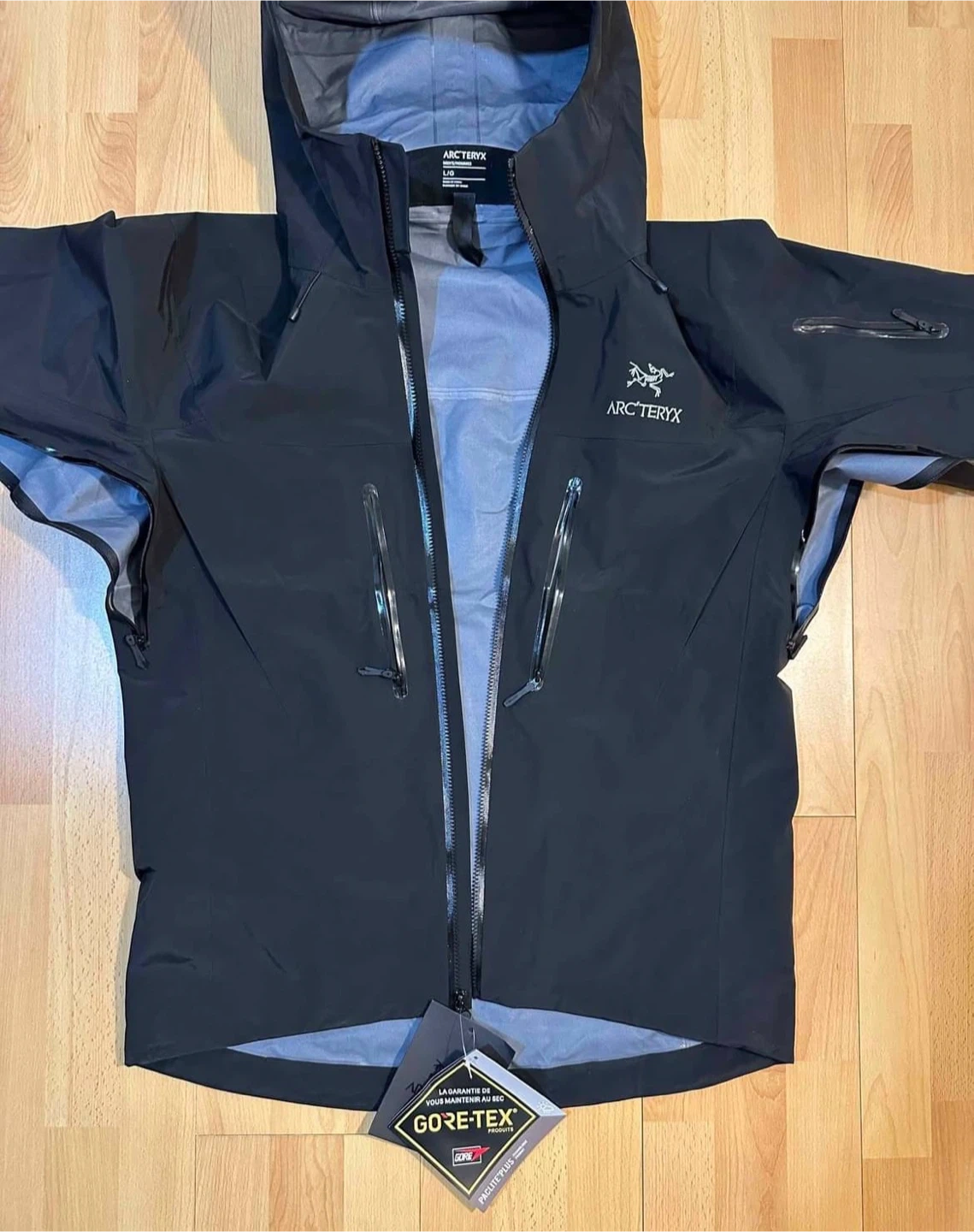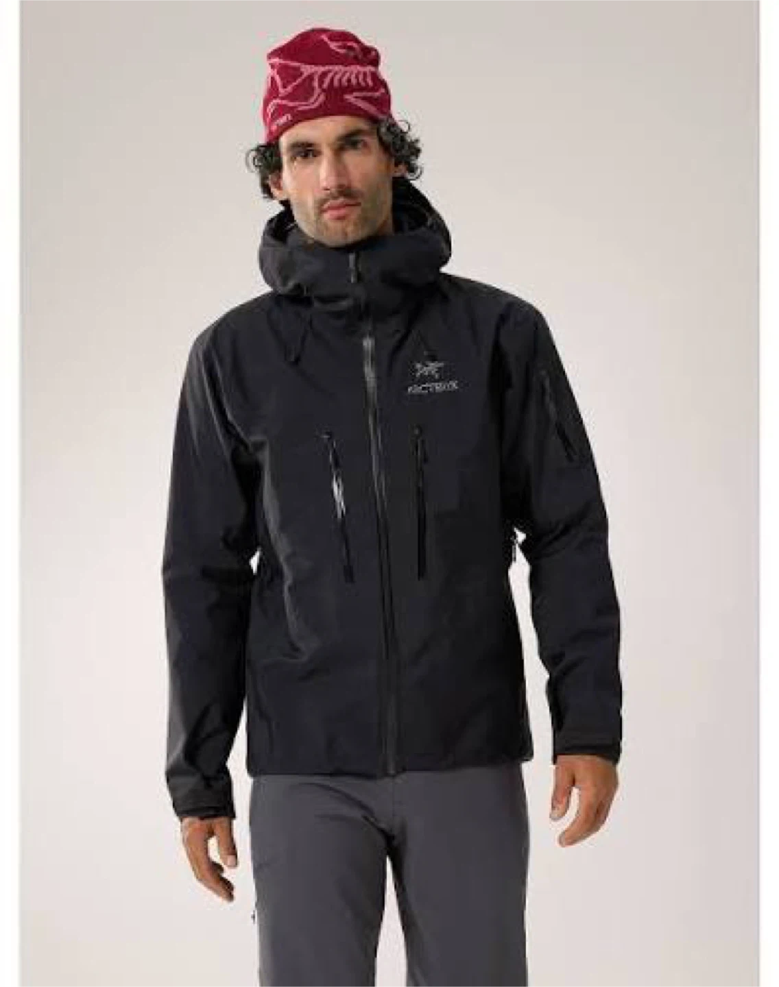This black Arc'teryx Alpha jacket is made with GORE-TEX. It features RECCO technology for safety. The jacket's shell is 100% nylon with a waterproof ePTFE membrane.