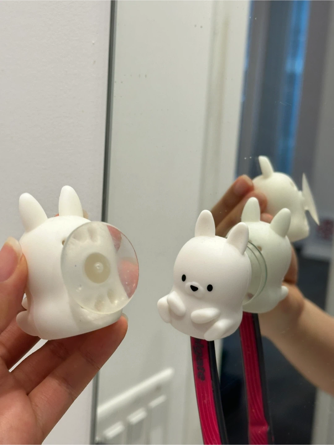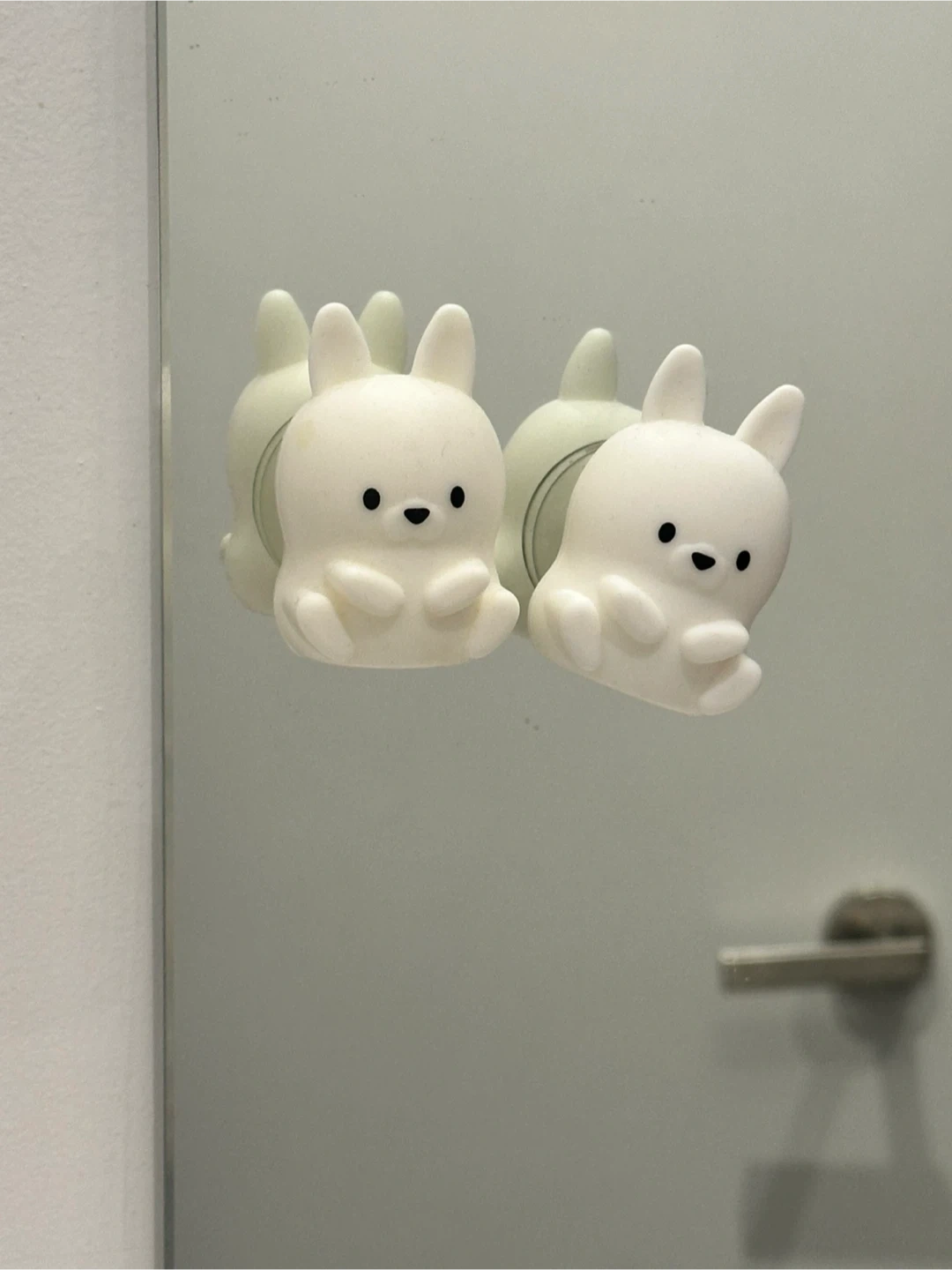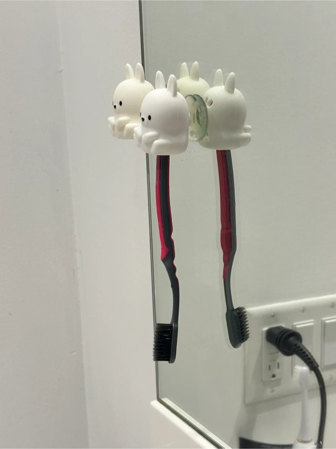 🐰Adorable white bunny toothbrush holders. These hold toothbrushes securely to mirrors or tile surfaces. They're a fun way to organize your bathroom! Made from durable silicone.