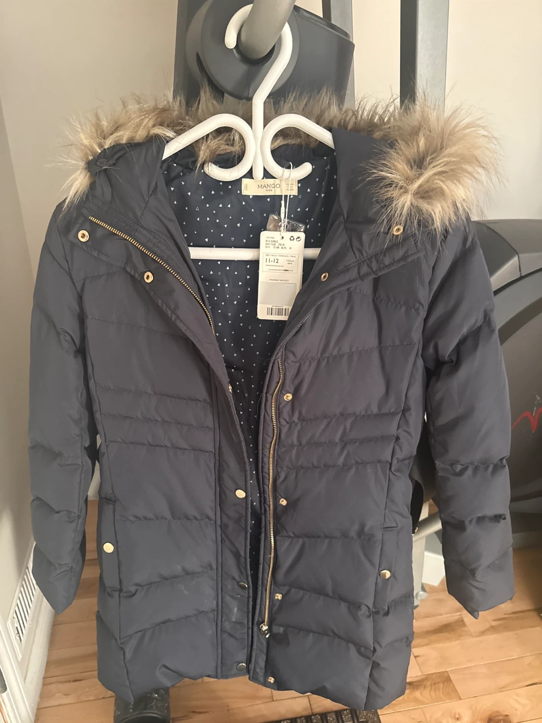 Keep your little one warm in this dark blue puffer coat from Mango Kids. It's designed with a faux fur-trimmed hood and a full zip closure with snap buttons. This coat is a size 11-12 years. It's perfect for chilly weather!