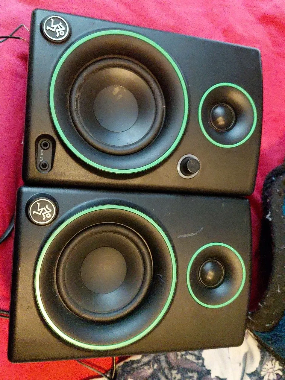 Selling a pair of Mackie CR4-X Creative Reference Monitors. These 4-inch monitors offer clear sound for creative work. They're black with distinctive green accents. Includes power cable and audio cables.