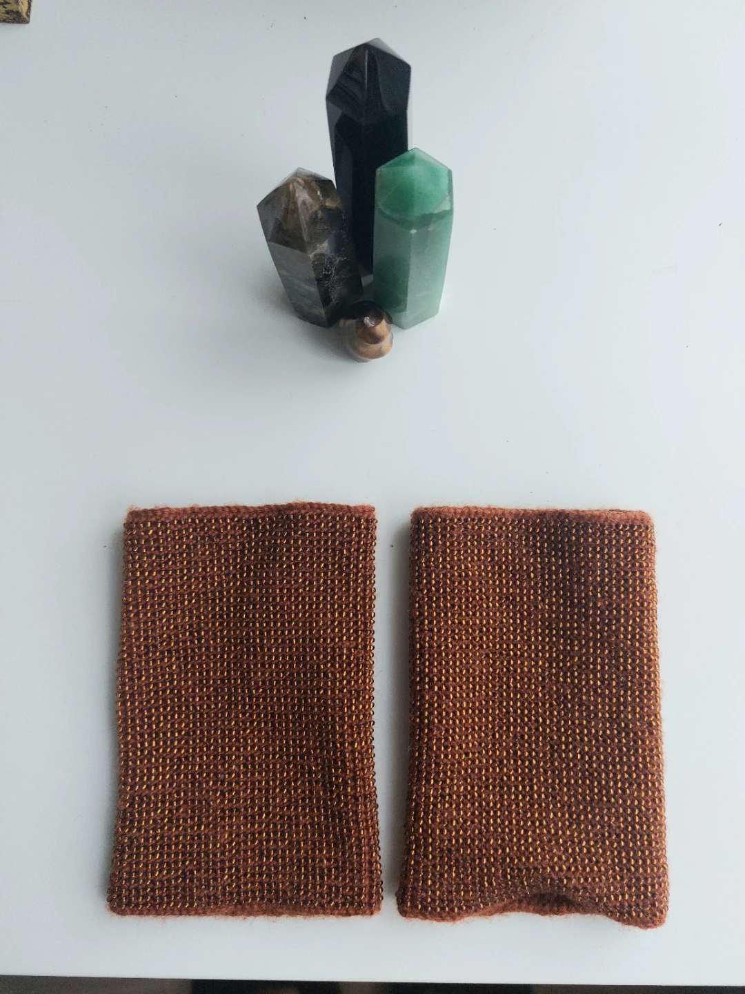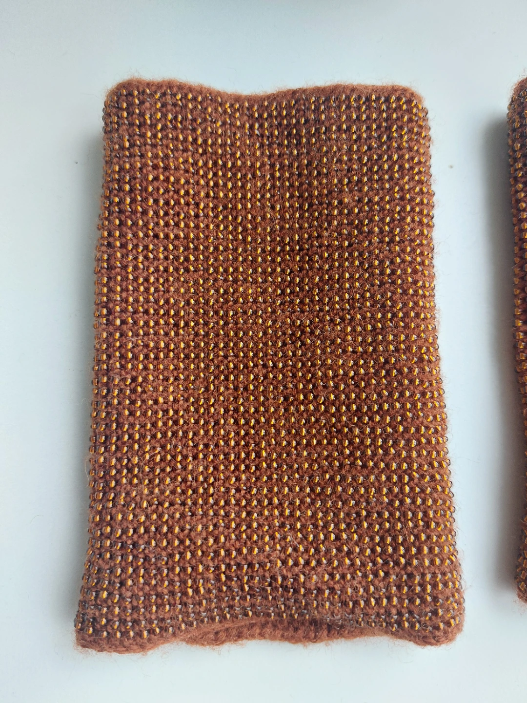 A pair of brown knitted wrist warmers embellished with small golden beads. They appear to be made from a wool blend material. These would add a touch of sparkle to an outfit!