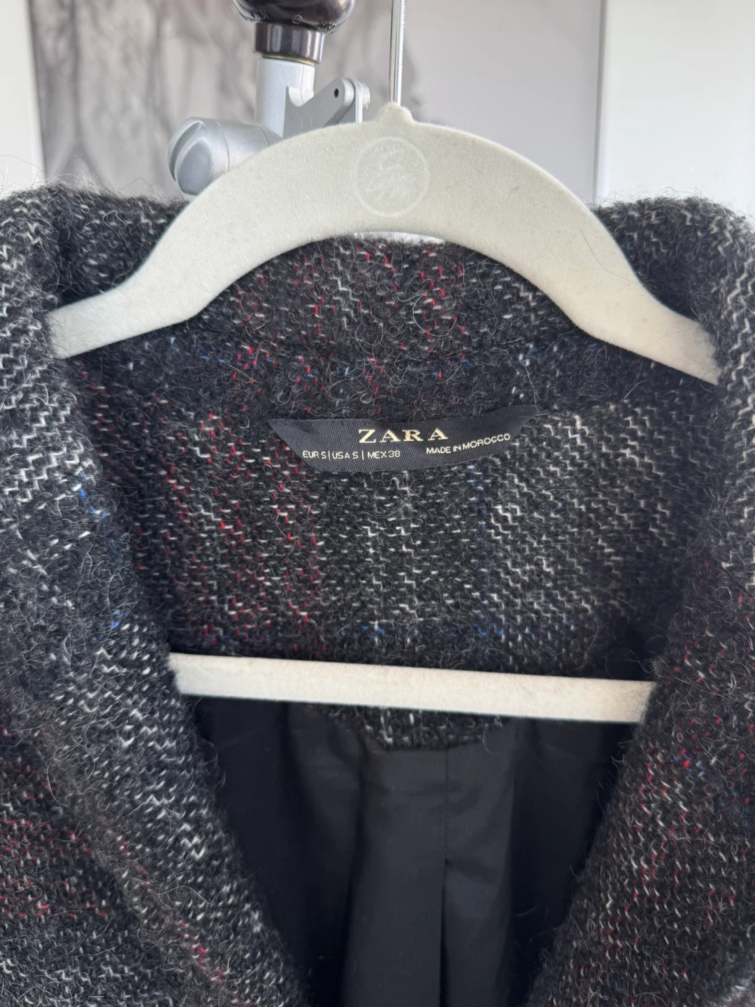 Made in Morocco. Selling a Zara wool blend coat in size small. It's in great condition and perfect for the cooler weather. The coat is made in Morocco and features a stylish design. It's a great addition to any wardrobe!