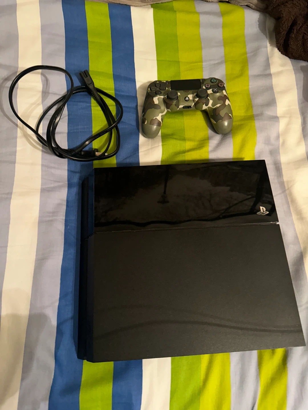 Selling a black PlayStation 4 console. It comes with one camouflage controller and power cable. Ready for your next gaming adventure!