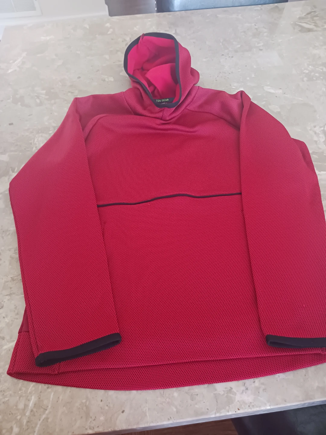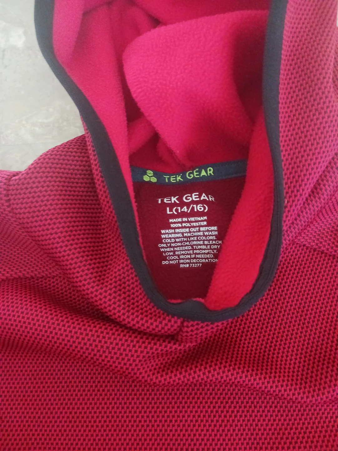 This is a red Tek Gear hoodie in size L (14/16). It's made of a textured polyester blend and features a hood with a black lining. The long sleeves have black cuffs.