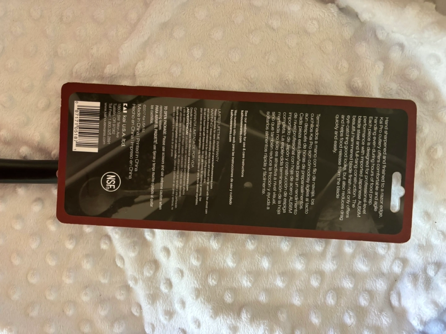 Black handle, hammered blade. New, in original packaging. Get the cool in your family this new pro knife.
