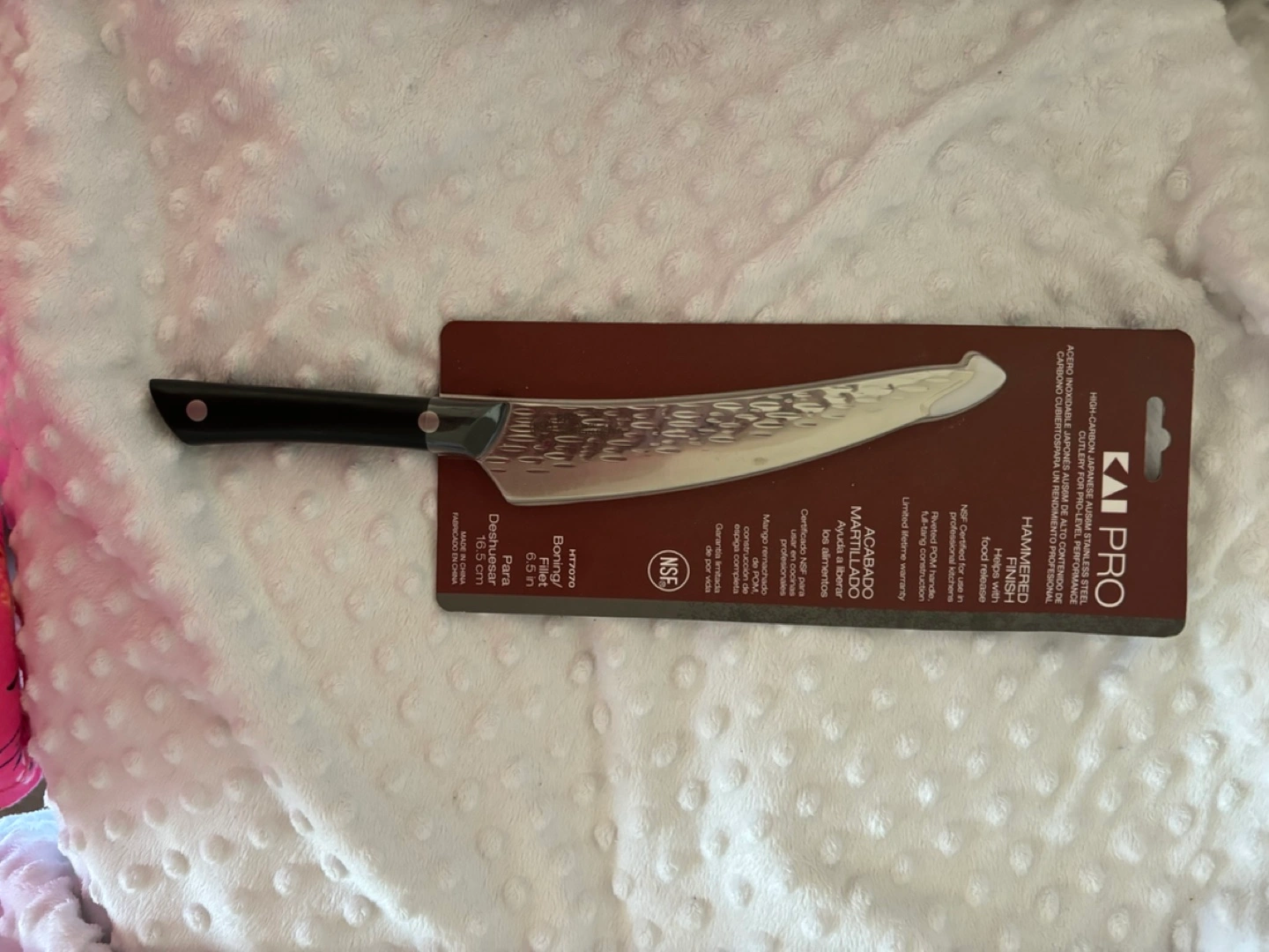 Black handle, hammered blade. New, in original packaging. Get the cool in your family this new pro knife.