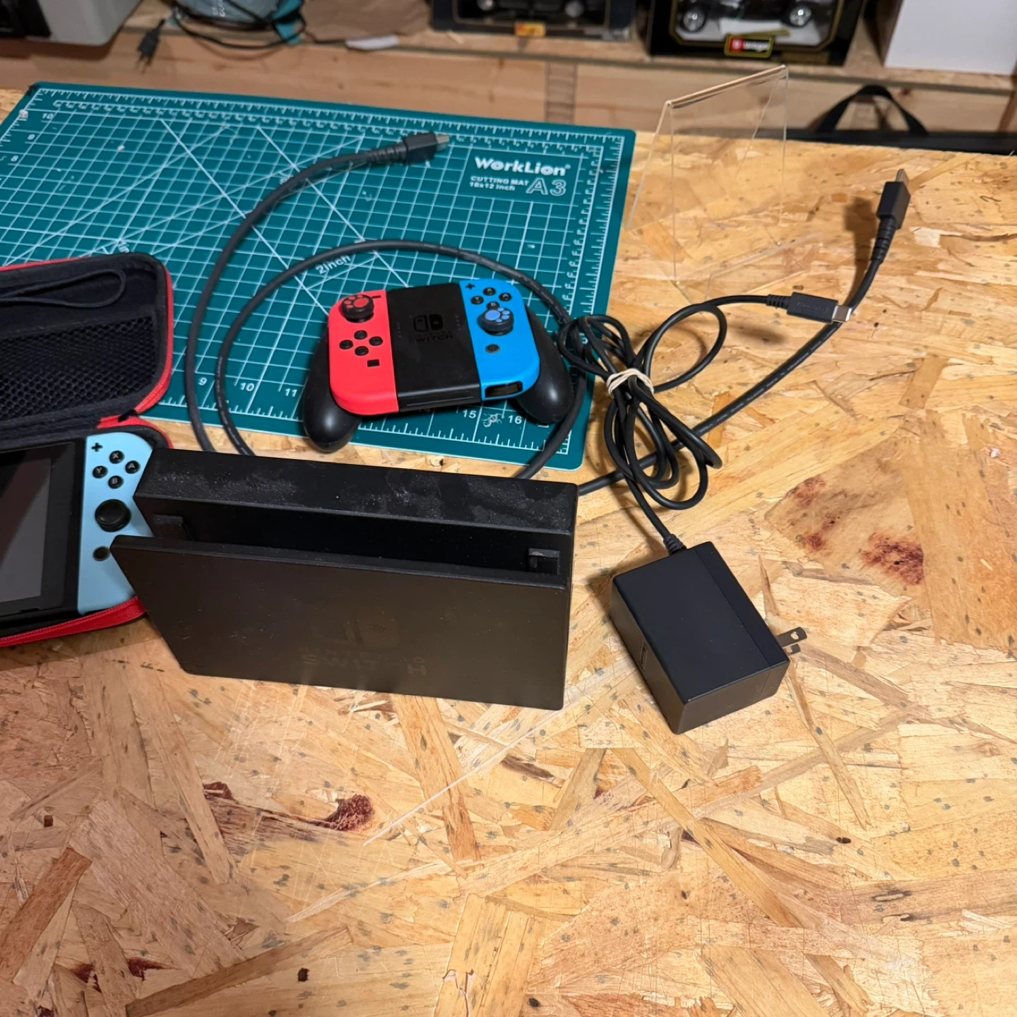 Nintendo Switch console with neon red and blue Joy-Cons. It's a great portable gaming system that also docks for TV play. Includes the dock, AC adapter, and a protective travel case. Play your favourite games on the go or at home!