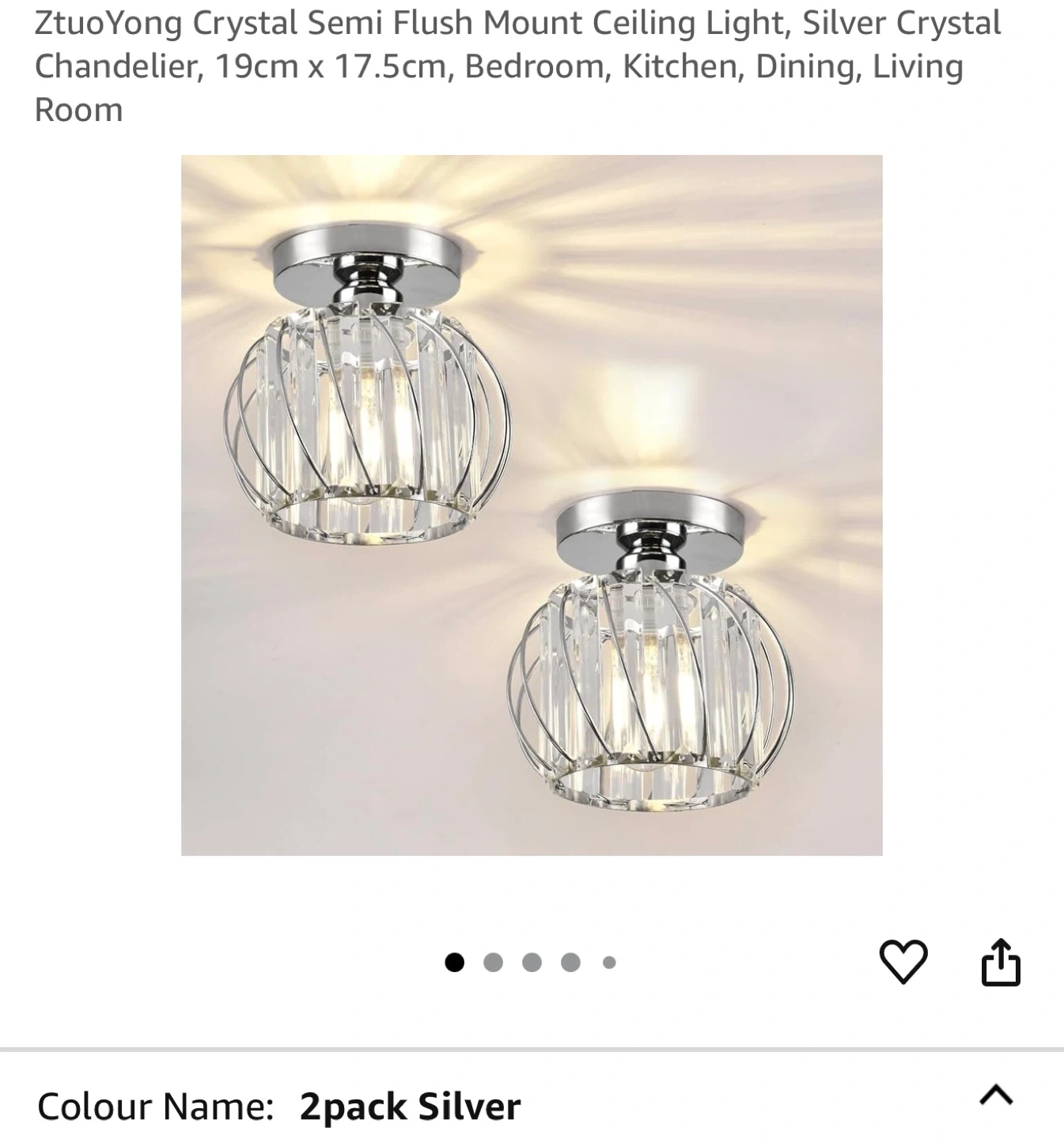Selling a crystal semi flush mount ceiling light. The dimensions are approximately 7.48 inches (19cm) in diameter and 7.08 inches (18cm) in height. Please note that the bulb is not included. It's compatible with E27 base bulbs. Great for adding a touch of elegance to your bedroom, kitchen, dining, or living room!
