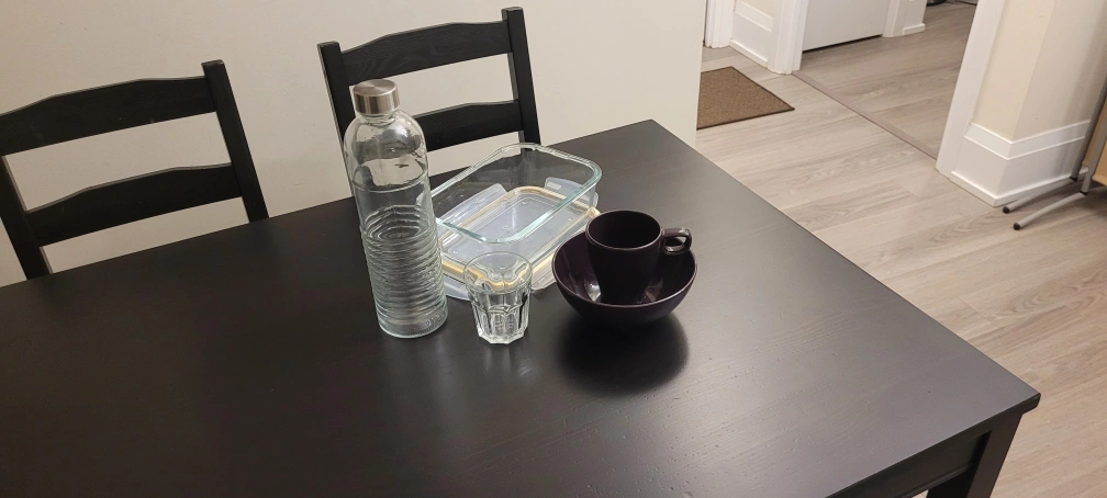 Includes a glass water bottle, a glass storage container with lid, and a dark purple coffee cup and saucer set. All items appear gently used.