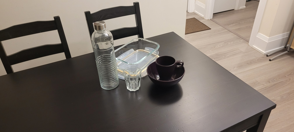 Includes a glass water bottle, a glass storage container with lid, and a dark purple coffee cup and saucer set. All items appear gently used.