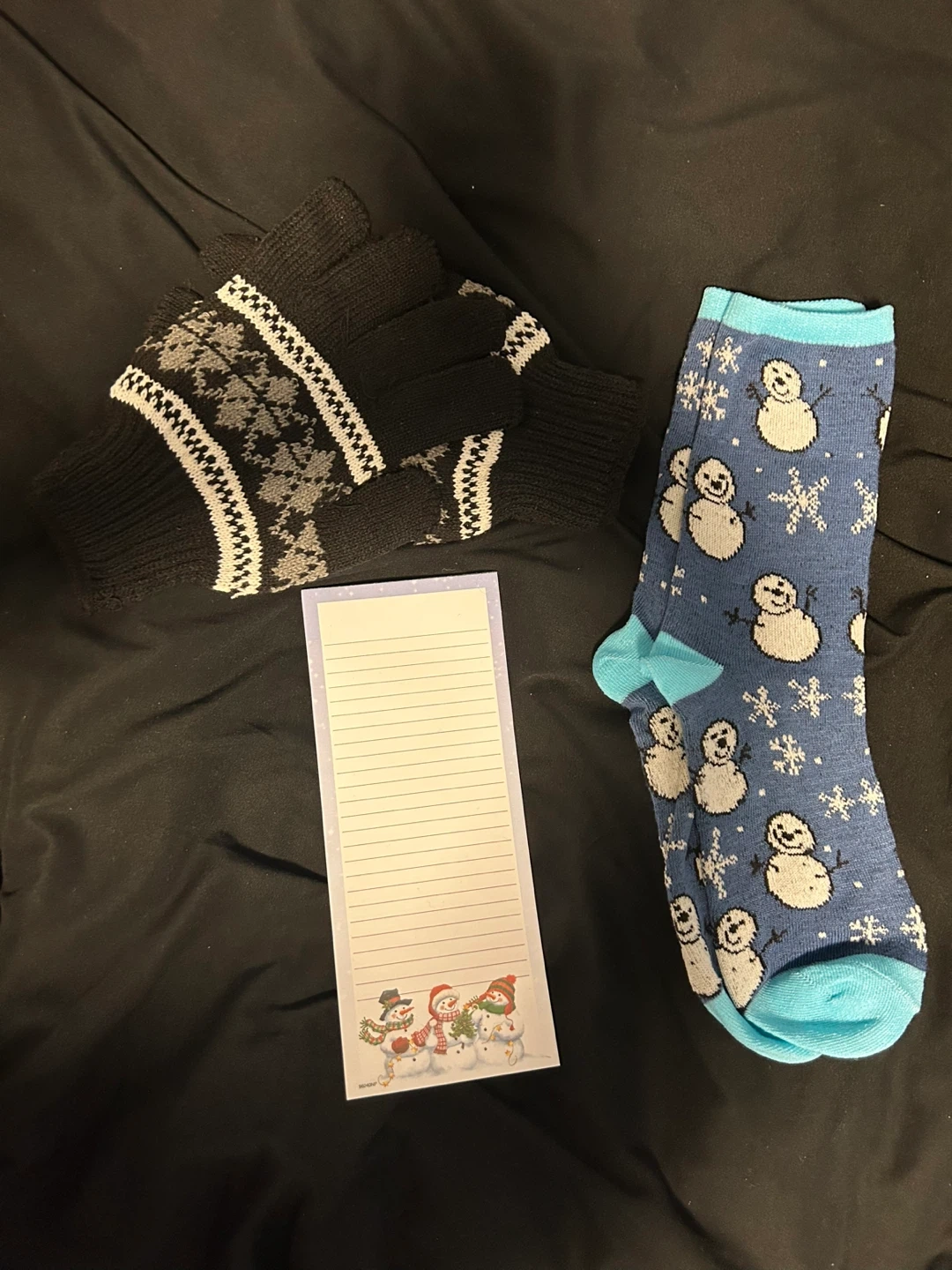 Cozy winter socks and gloves featuring a cute snowman pattern. Includes a festive magnetic notepad with snowman graphics. Perfect for adding some holiday cheer to your day! #freecycle