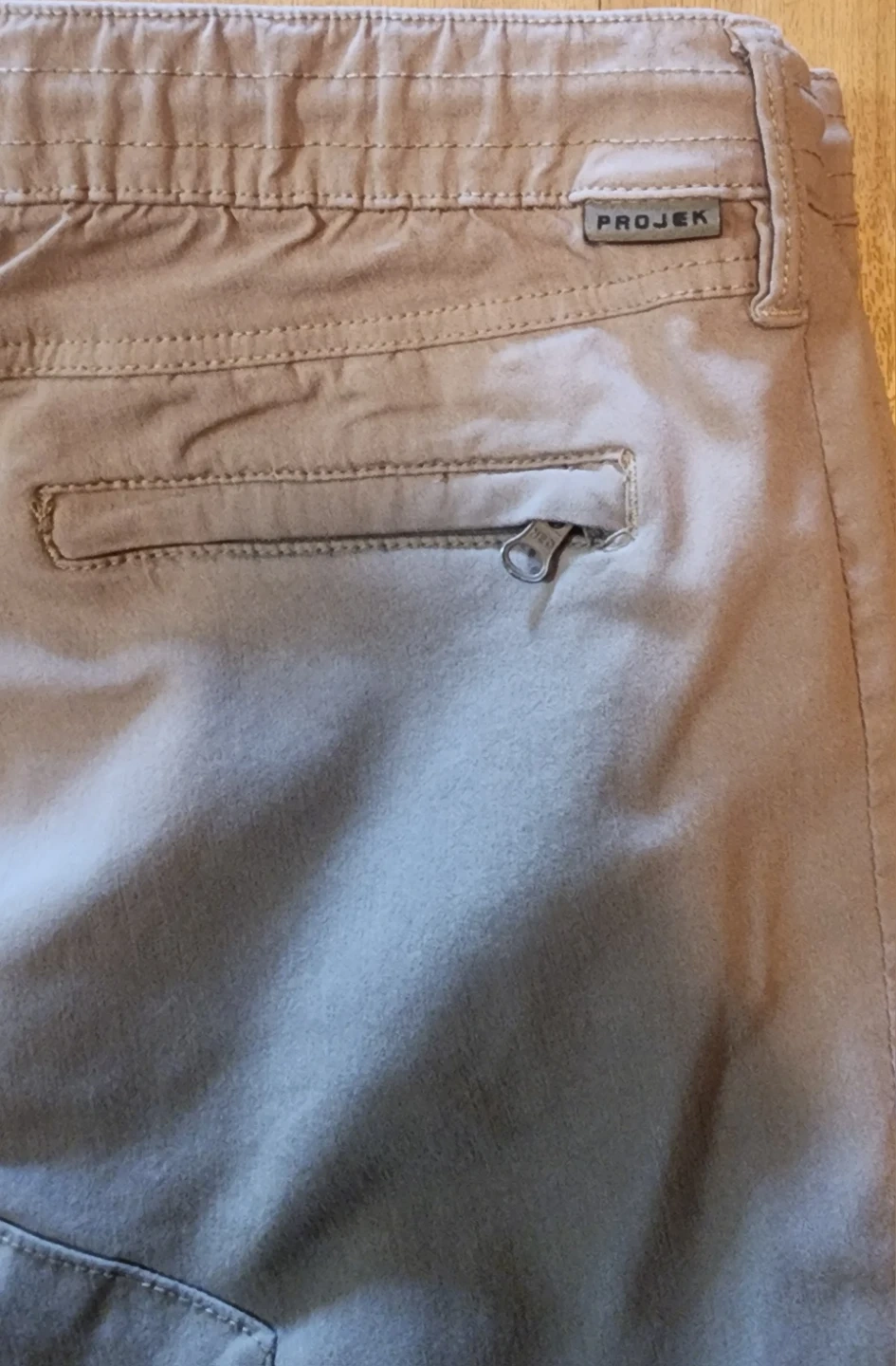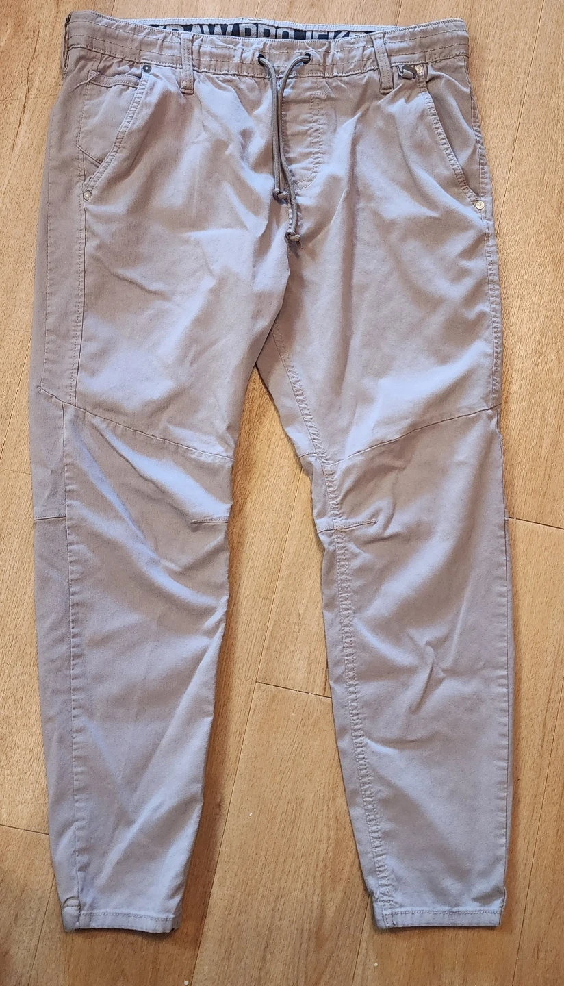 in a neutral gray colour. These pants feature a drawstring waist and zippered back pocket.