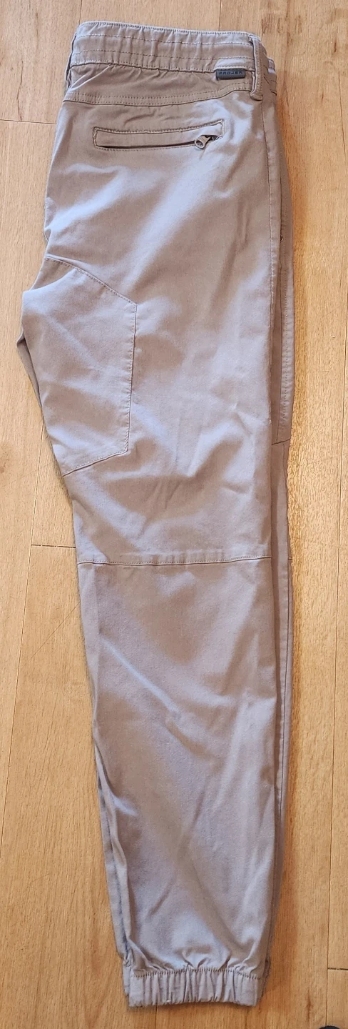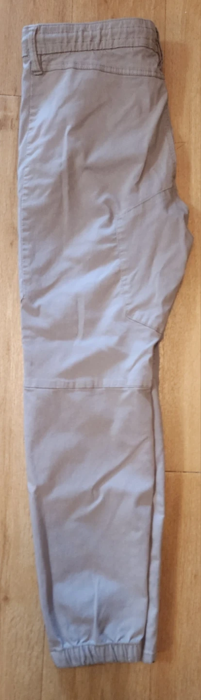 in a neutral gray colour. These pants feature a drawstring waist and zippered back pocket.