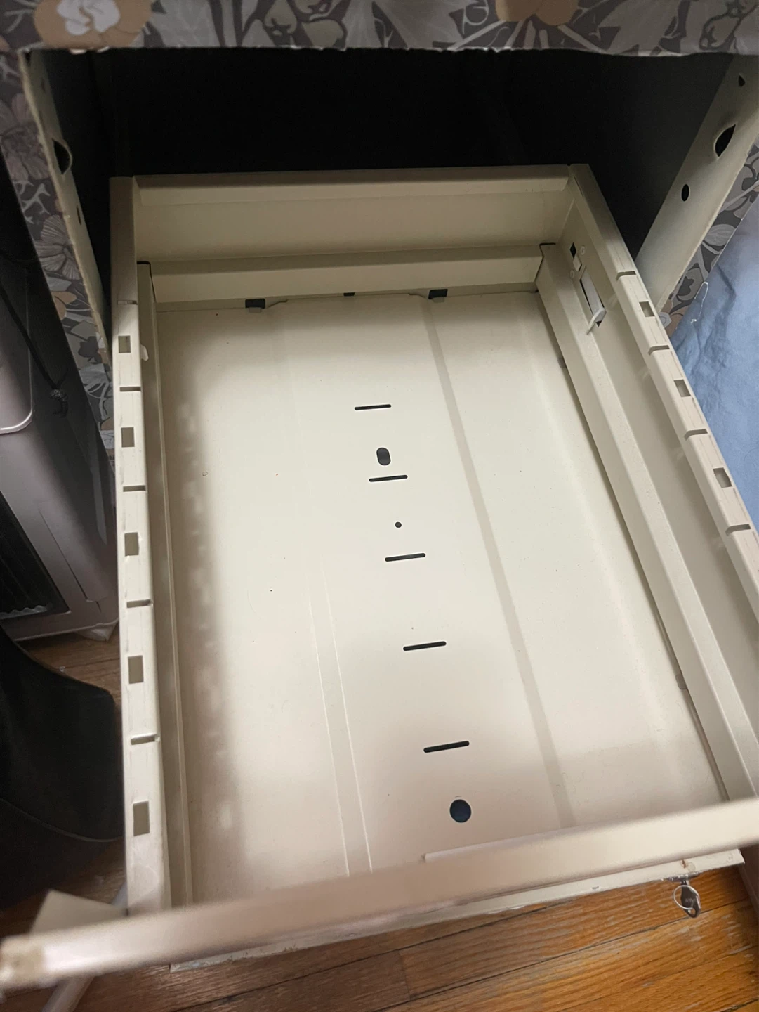 Overall in good condition. One key to lock the cabinet and one hanging filing frame (check last photo).