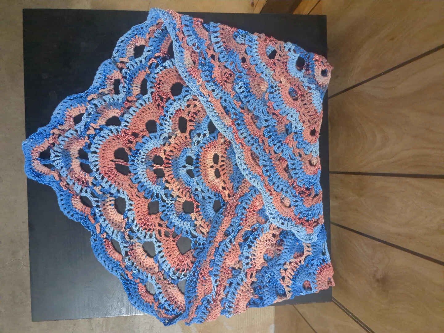 This is a beautiful handmade crochet shawl. It features intricate openwork detailing - a showcase feature of the Virus pattern utilized in its creation. The yarn has a mix of blue and coral pink/red colours with a lace-y shimmer to certain sections that creates a gradient effect
