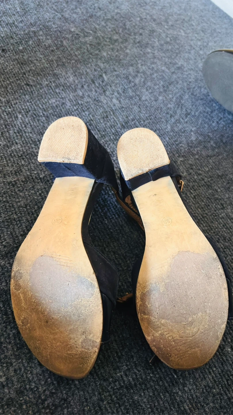 These black block heel sandals feature a navy blue suede upper with a patent toe strap. They have an adjustable ankle strap for a secure fit. Size is 36.
