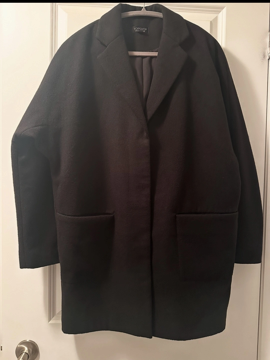 Selling a Topshop black coat, size US 8. It's in great condition and ready for a new owner! This stylish coat is perfect for layering during the cooler months. It's a versatile piece that can be dressed up or down.