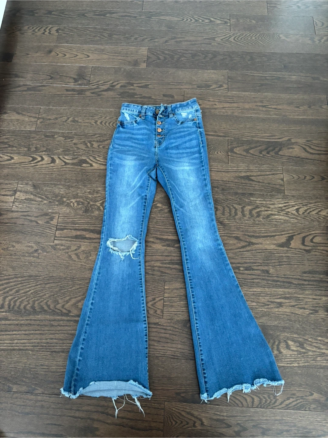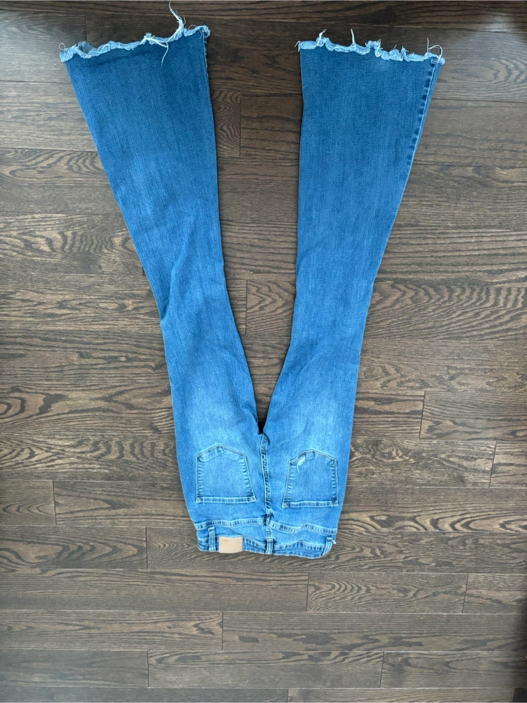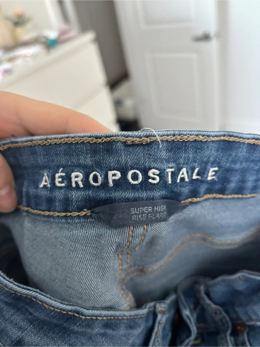 Selling a pair of Aeropostale Super High Rise Flare jeans in size 4. They're in good condition, with a fashionable distressed detail on the leg. Perfect for adding a bit of flair to your wardrobe!