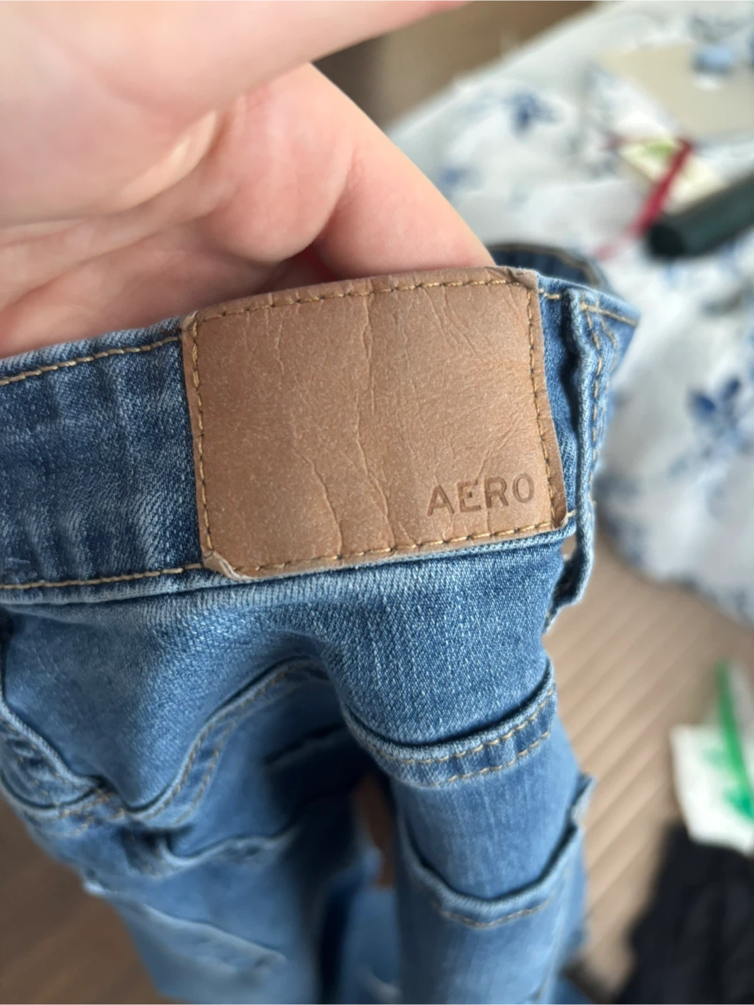 Selling a pair of Aeropostale Super High Rise Flare jeans in size 4. They're in good condition, with a fashionable distressed detail on the leg. Perfect for adding a bit of flair to your wardrobe!