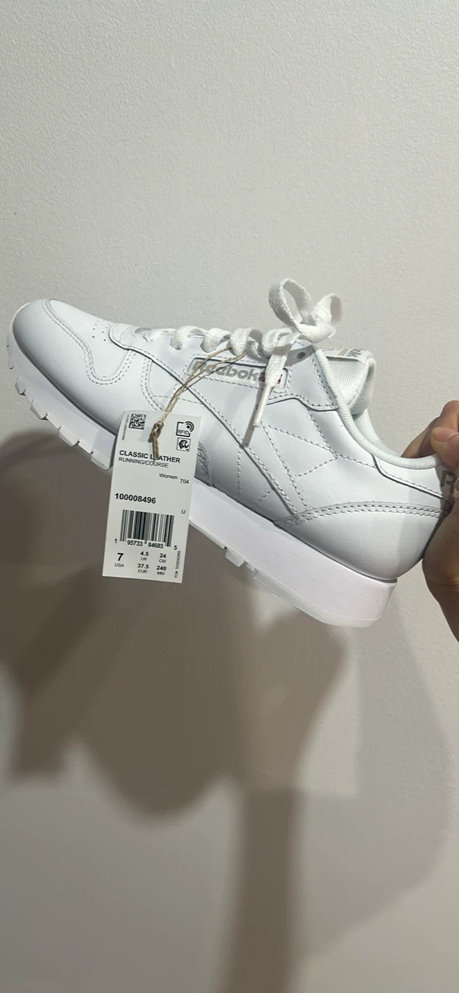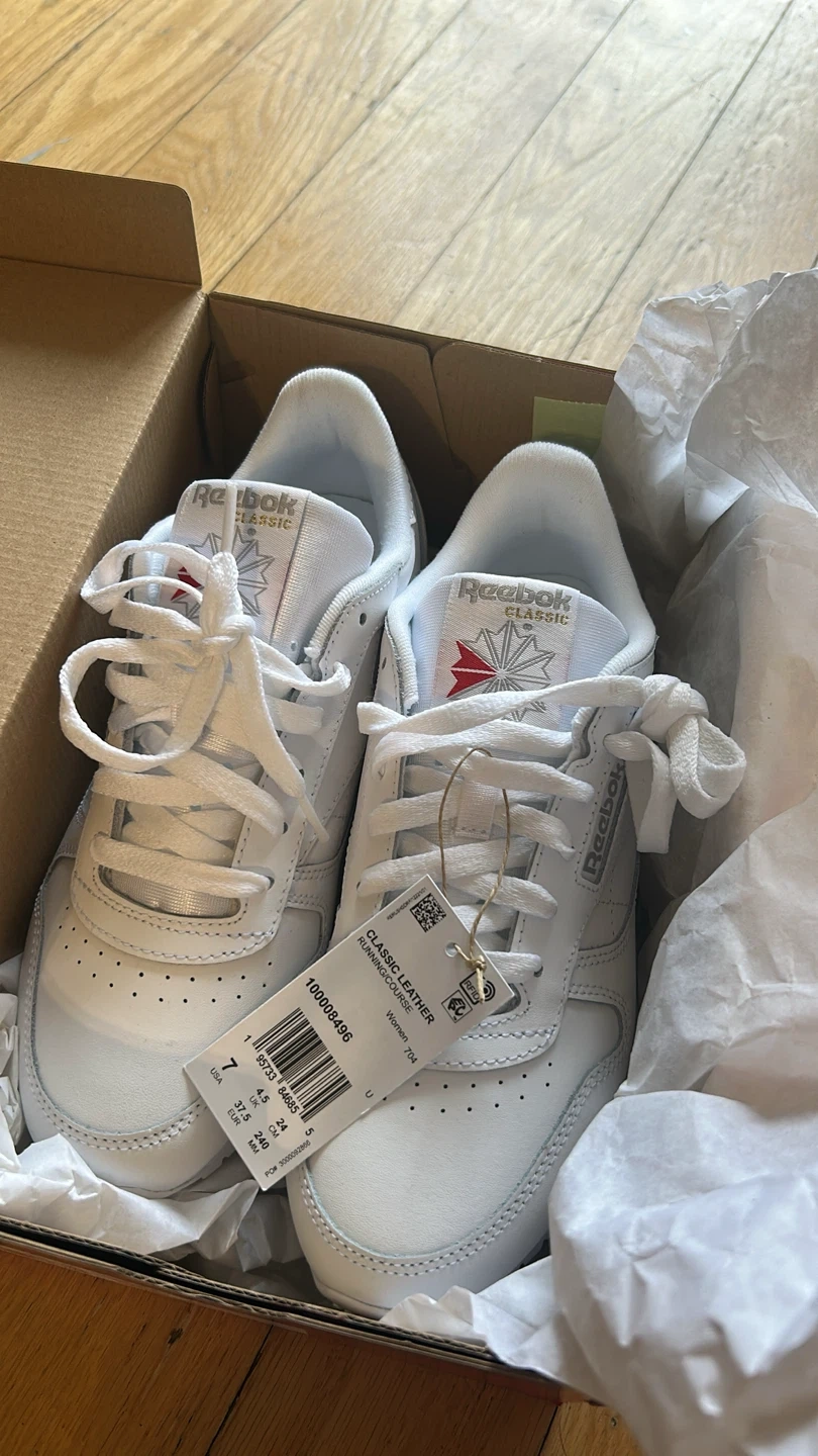 These are white Reebok Classic Leather running shoes for women. They're a size 7 USA and made of leather. Includes original box and tags.