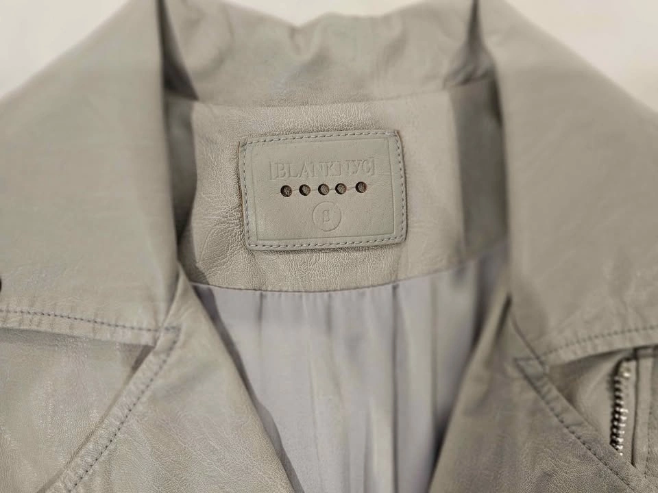 Stylish BLANKNYC faux leather moto jacket in gray, size S. Features a cool asymmetrical zipper and zippered pockets, with snap buttons on the collar.