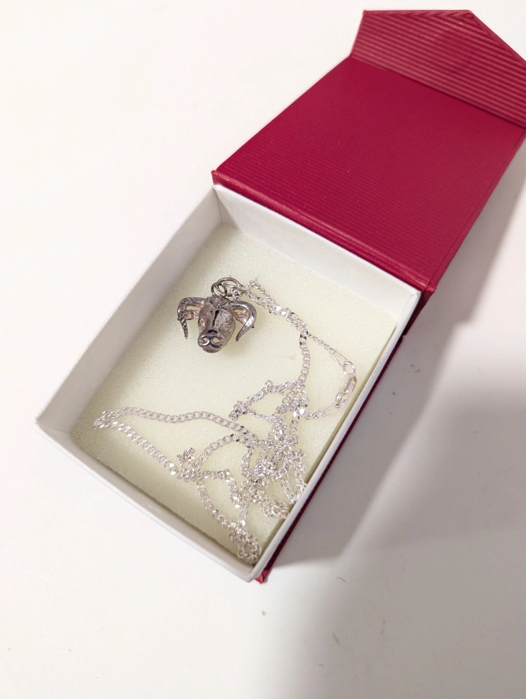 Selling a silver necklace with a ram pendant. It comes in a box, perfect as a gift for yourself or someone else! The chain is a delicate silver and the pendant has intricate detailing. New, never used.