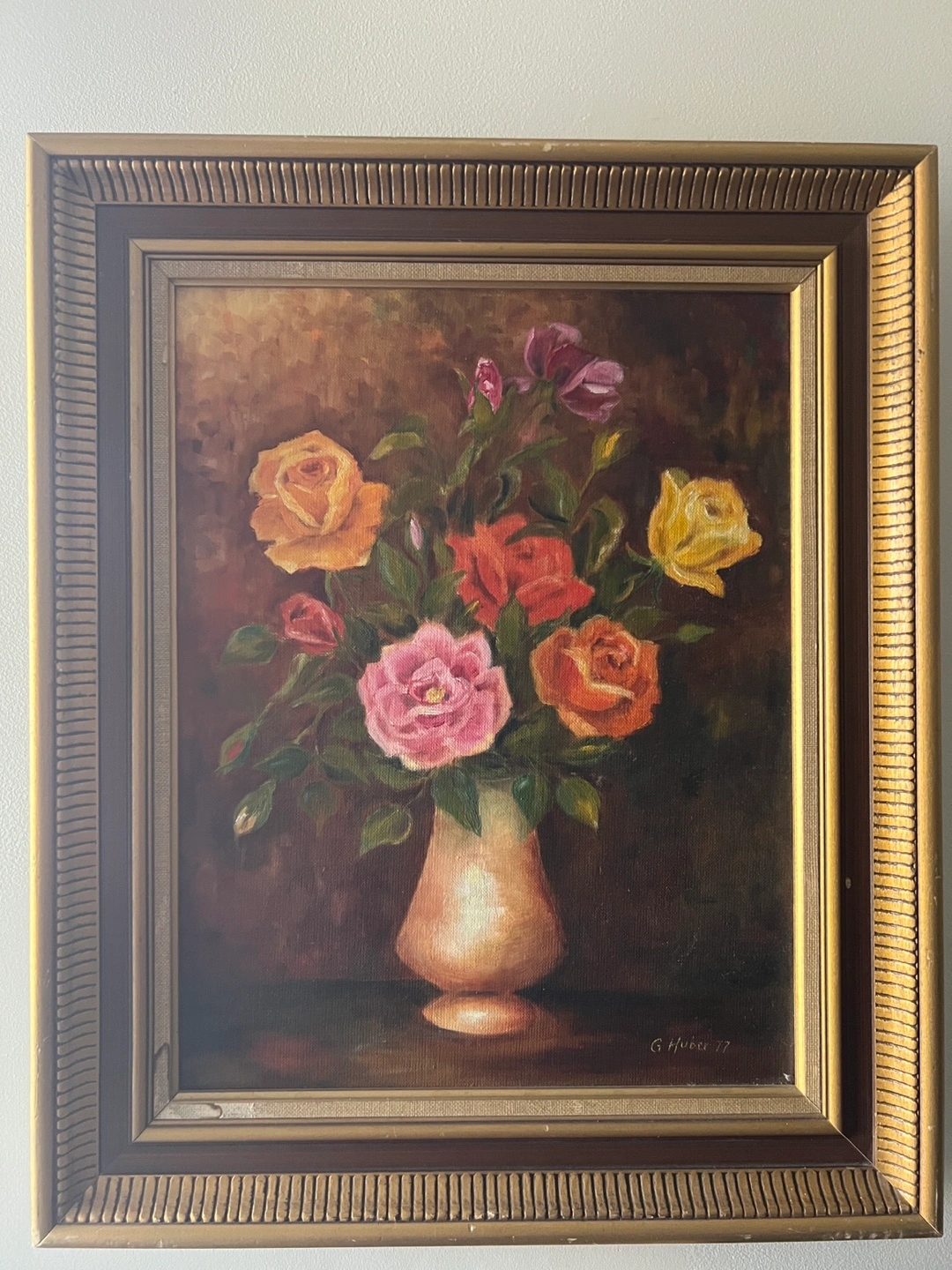 Lovely vintage oil painting of roses in a vase. Framed in a gold-coloured frame. Signed G. Hubb 77. A beautiful addition to your home décor.
