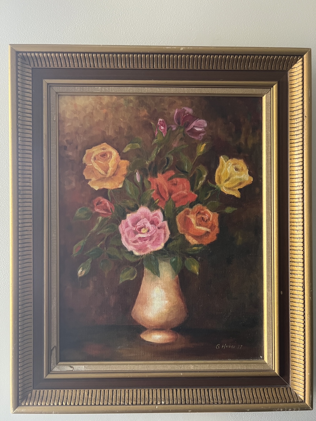 Lovely vintage oil painting of roses in a vase. Framed in a gold-coloured frame. Signed G. Hubb 77. A beautiful addition to your home décor.