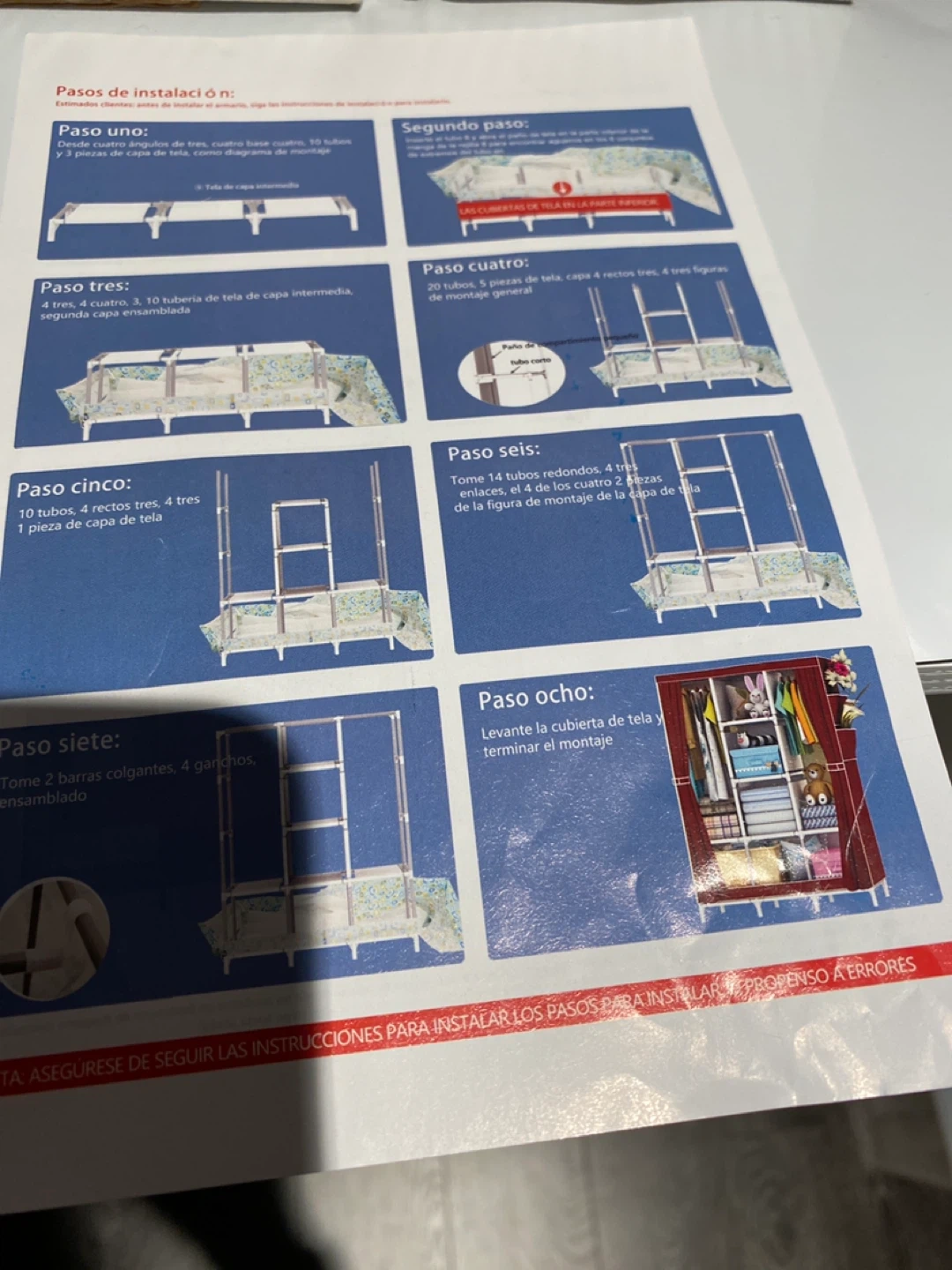 This is an instruction manual for a portable wardrobe. It details the assembly steps using diagrams and text. The manual covers the entire process from unpacking to the final setup of the garment organizer.