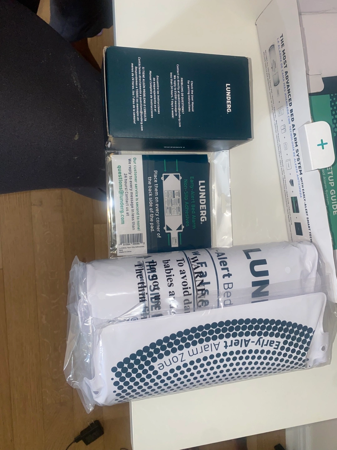 Selling a Lunderg Early-Alert Bed Alarm System with Wireless Sensor Pad & Monitor. It helps prevent falls with pre-alert technology. The box is included, along with the setup guide and accessories. It includes a sensor and monitor.