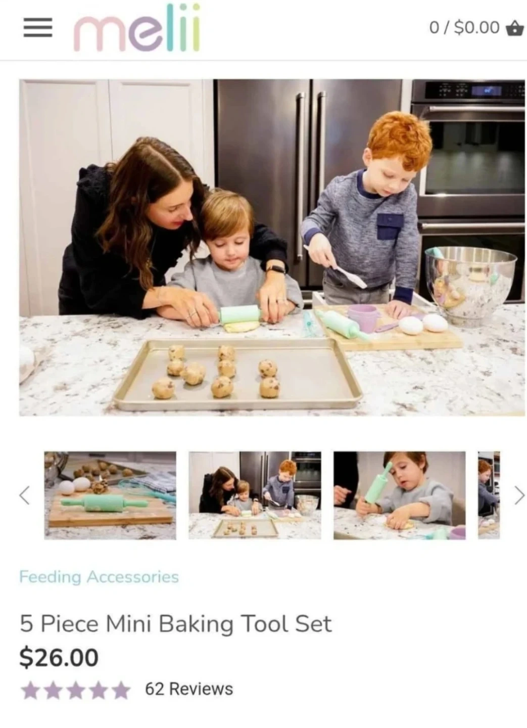 This is a 5-piece mini baking tool set from Meli. It's designed for little chefs to help in the kitchen. The set includes a whisk, spatula, and other mini tools for baking fun!