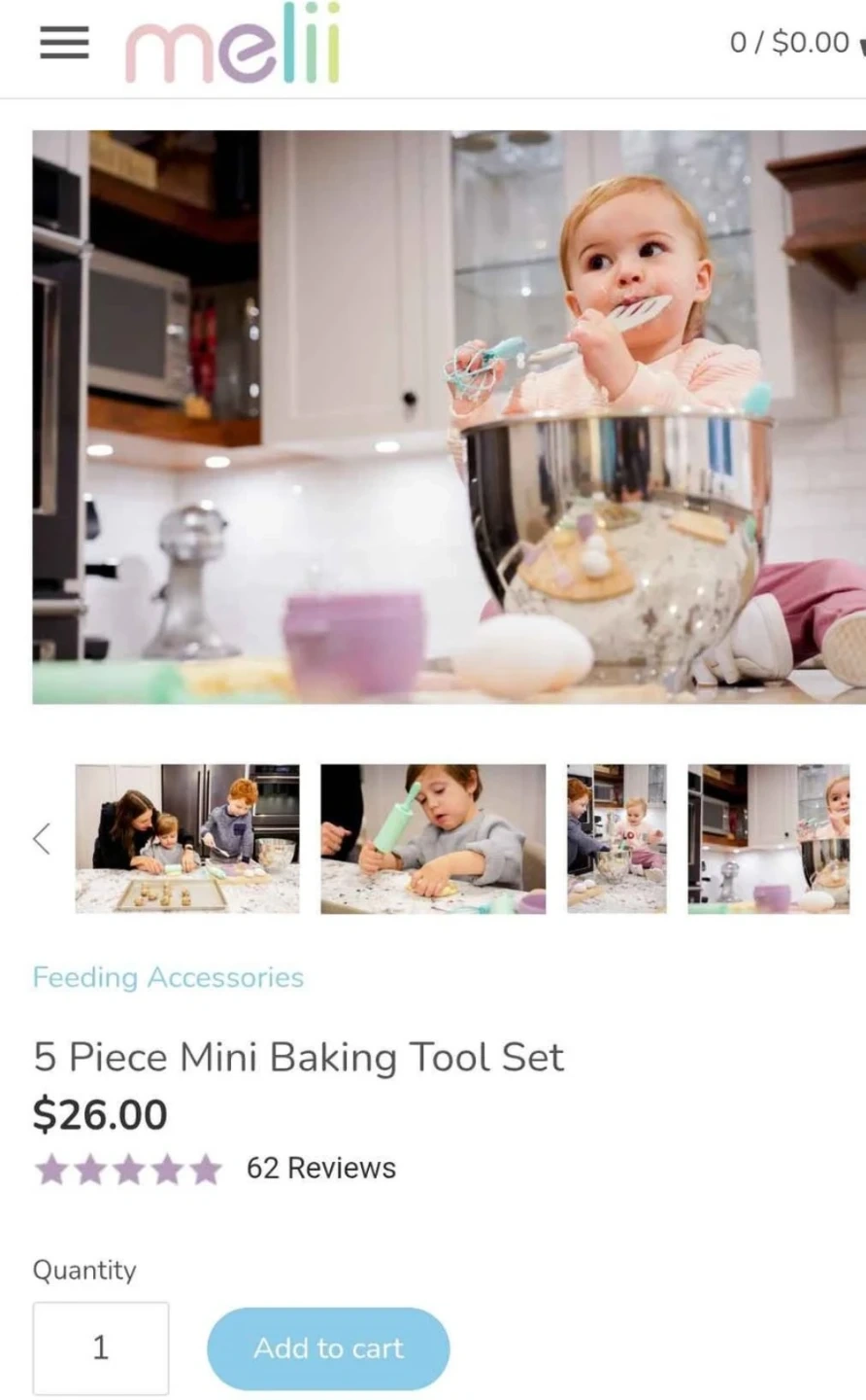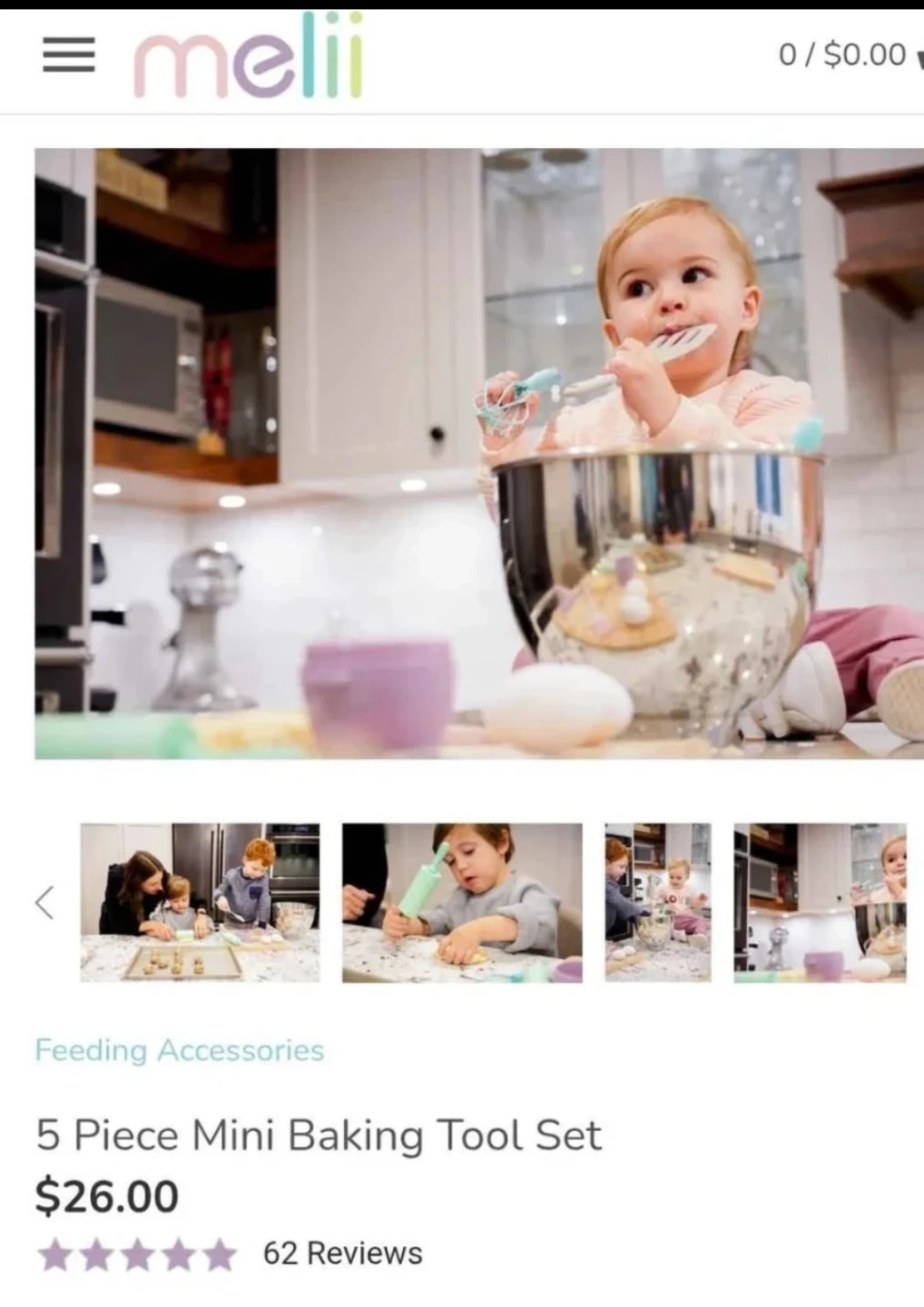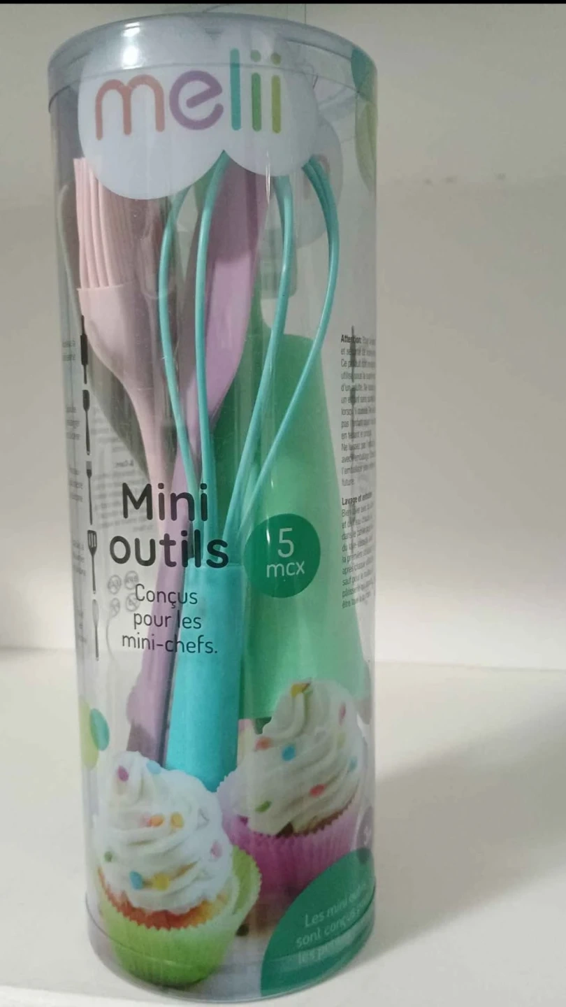 This is a 5-piece mini baking tool set from Meli. It's designed for little chefs to help in the kitchen. The set includes a whisk, spatula, and other mini tools for baking fun!